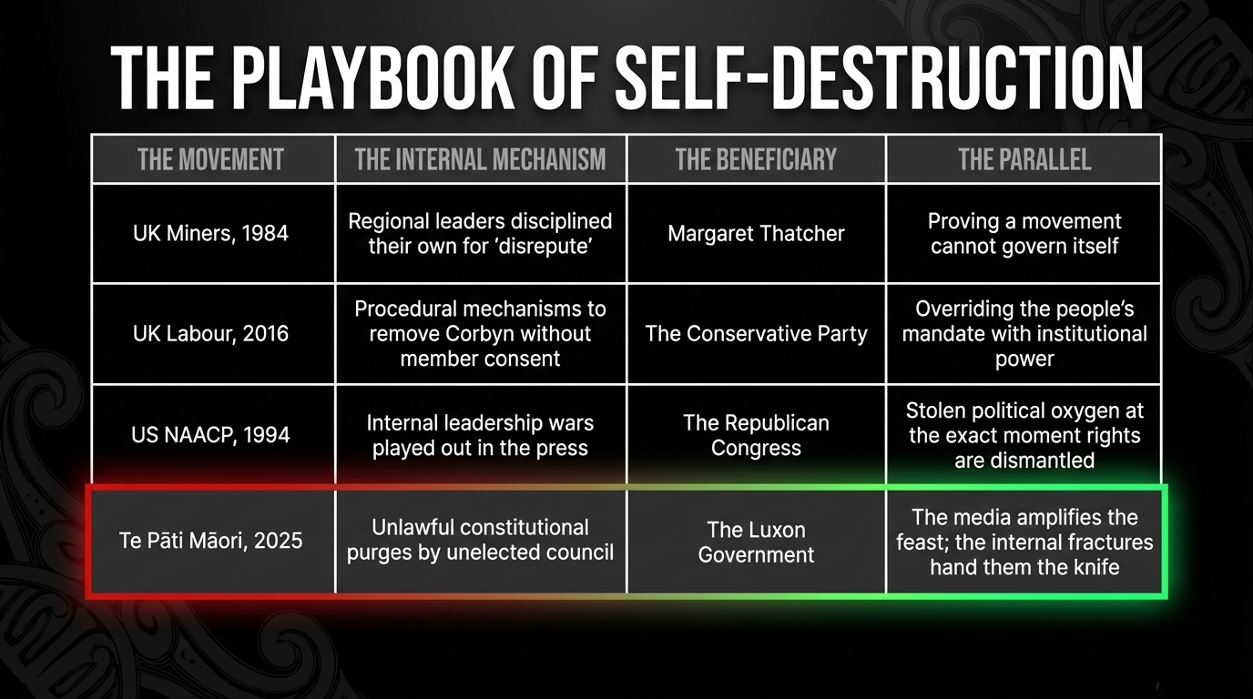 During the British Miners' Strike, the National Union of Mineworkers' internal splits — where regional leaders began disciplining their own members for "disrepute" — handed Thatcher exactly the weapon she needed to crush the movement. The government didn't break the union. The union broke the union. The parallel: When Te Pāti Māori expelled its own electorate MPs on procedurally unlawful grounds, it handed the Luxon government a gift worth more than any policy win — proof, broadcast nationally, that the Māori political movement cannot govern itself. Every Pākehā voter who was "on the fence" about Māori co-governance just got their excuse.