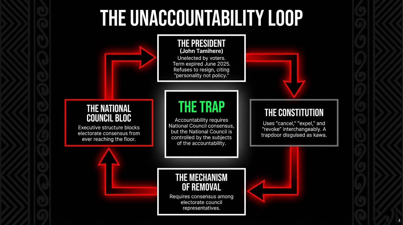 The constitutional trap he exploits is real. As The Spinoff's analysis confirmed, the only mechanism to remove him requires consensus among electorate council representatives — the same National Council he controls. He almost gloated at the AGM that opponents "simply didn't have the numbers." He was first elected to the presidency in June 2022 for a three-year term, meaning it expired in June 2025. A 2024 AGM "reaffirmed" him — but only approximately 20 people attended, as The Spinoff confirmed, raising serious questions about constitutional legitimacy that remain unresolved.