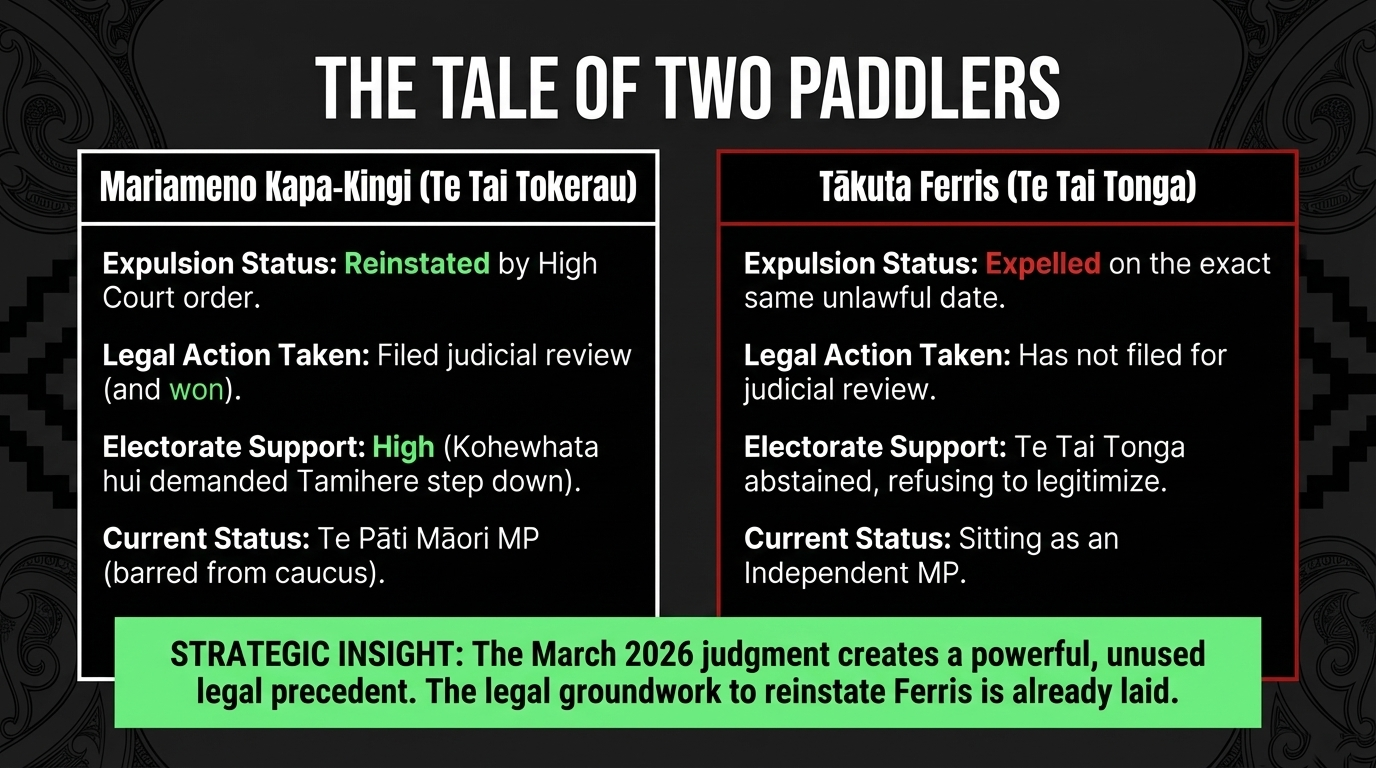 This is the open wound no one is talking about loudly enough. Ferris — the MP for Te Tai Tonga — was expelled in the same unlawful process on 9 November 2025. The critical difference: while Kapa-Kingi immediately filed for judicial review and won, Ferris has not challenged his expulsion in court, as the NZ Herald confirmed. Without a court challenge, there is no legal mechanism to compel his reinstatement — regardless of the fact that Justice Radich found the same process used against both MPs to be unlawful. The ruling was Kapa-Kingi v Tamihere. Not Ferris v Tamihere.