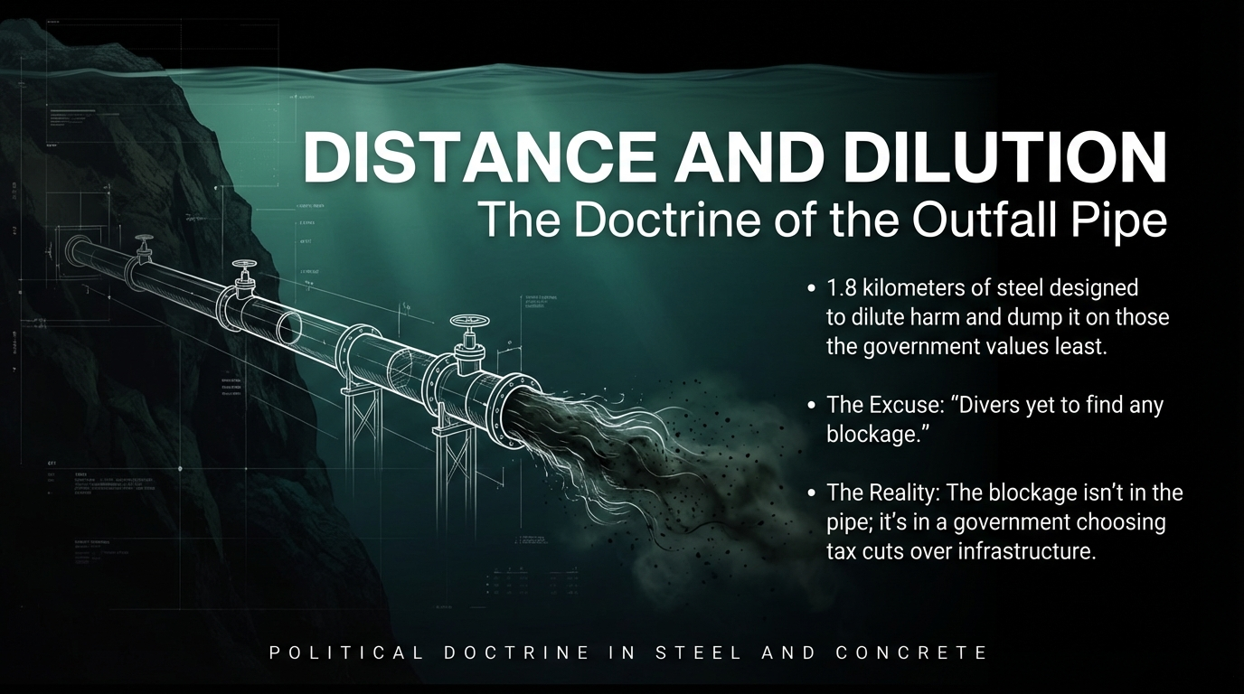 The sewage is being pumped out through the plant’s 1.8 km outfall pipe to “reduce harm to beaches.” RNZ That pipe is not just infrastructure; it is political doctrine in steel and concrete.