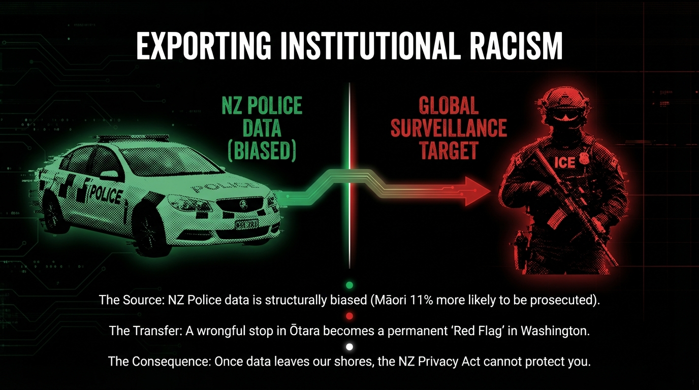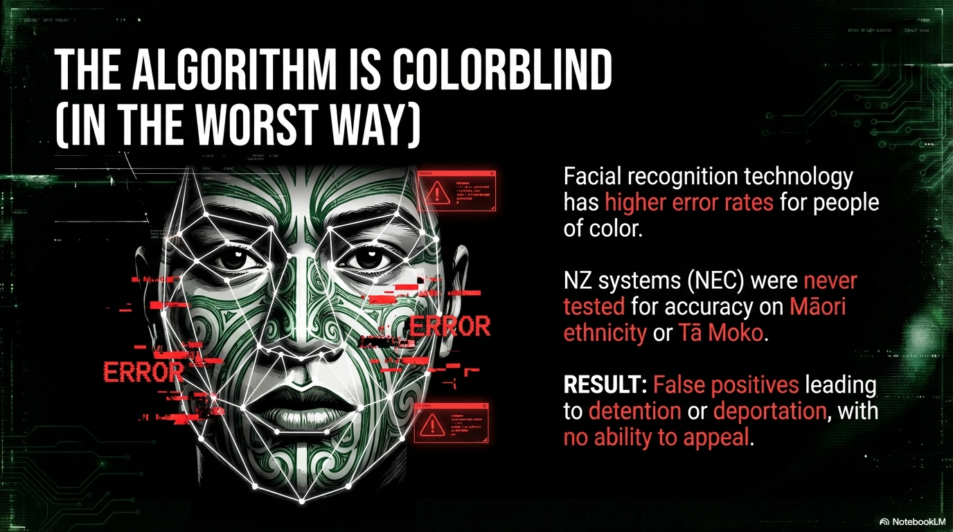 - NZ Police biometric systems have documented racial bias against Māori, and those databases are candidates for international sharing — exporting institutional racism as automated data, as the Understanding Policing Delivery report confirmed and RNZ detailed.