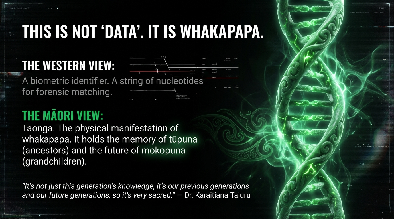 For the Western mind, DNA is a biological identifier — a string of nucleotides useful for forensic matching. For Māori, DNA is the physical manifestation of whakapapa itself. It carries the memory of tūpuna. It encodes the relationships between hapū. It is, as Dr Karaitiana Taiuru told RNZ, "not just this generation's knowledge — it's our previous generations and our future generations, so it's very sacred."