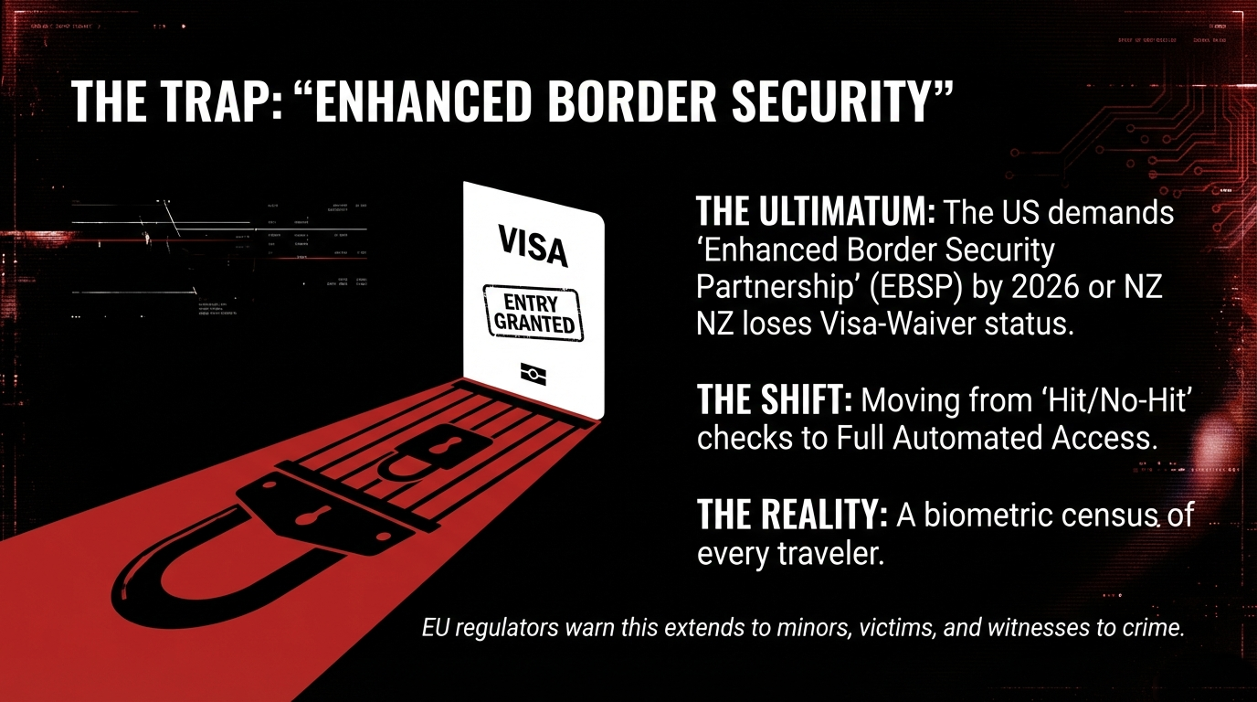 The Situation: Under the Enhanced ESTA requirements, visitors must disclose personal details of family members, five years of phone numbers, email addresses from the past decade, and social media accounts, as RNZ reported. Under a full EBSP, the US could query New Zealand databases not just about the traveller but about people associated with travellers, as RNZ's investigation revealed.