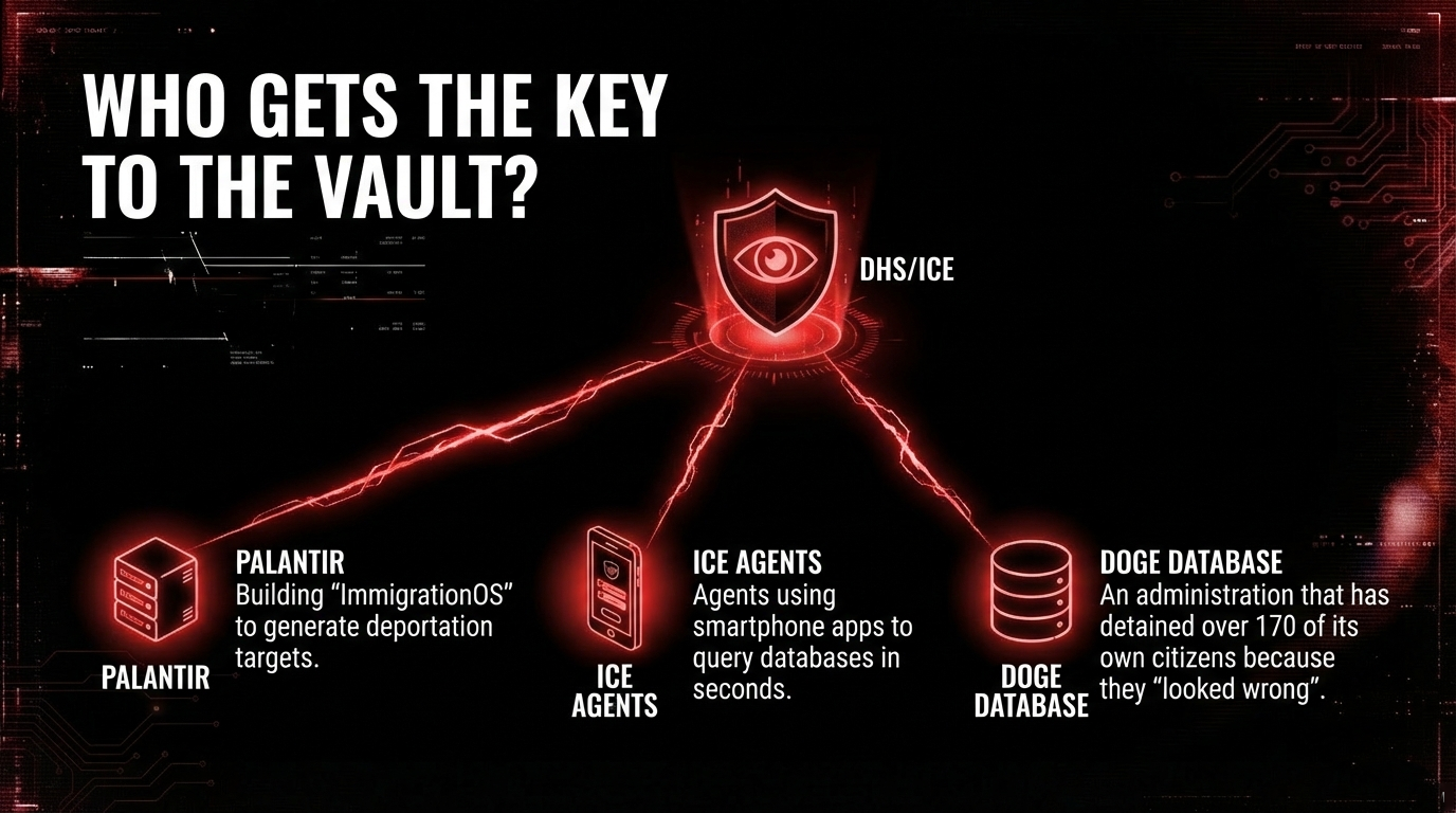 And right now — today, this week — the Luxon-Seymour-Peters coalition government is negotiating to hand the key to that vault to the Trump administration's Department of Homeland Security: the same government that deploys masked agents who disappear people off streets, the same government building a Palantir-powered deportation machine that uses IRS tax data, Medicaid records, and facial recognition to hunt human beings, and the same government whose own border agents have detained over 170 American citizens — pointing guns at children aged six and eight — because they looked wrong.