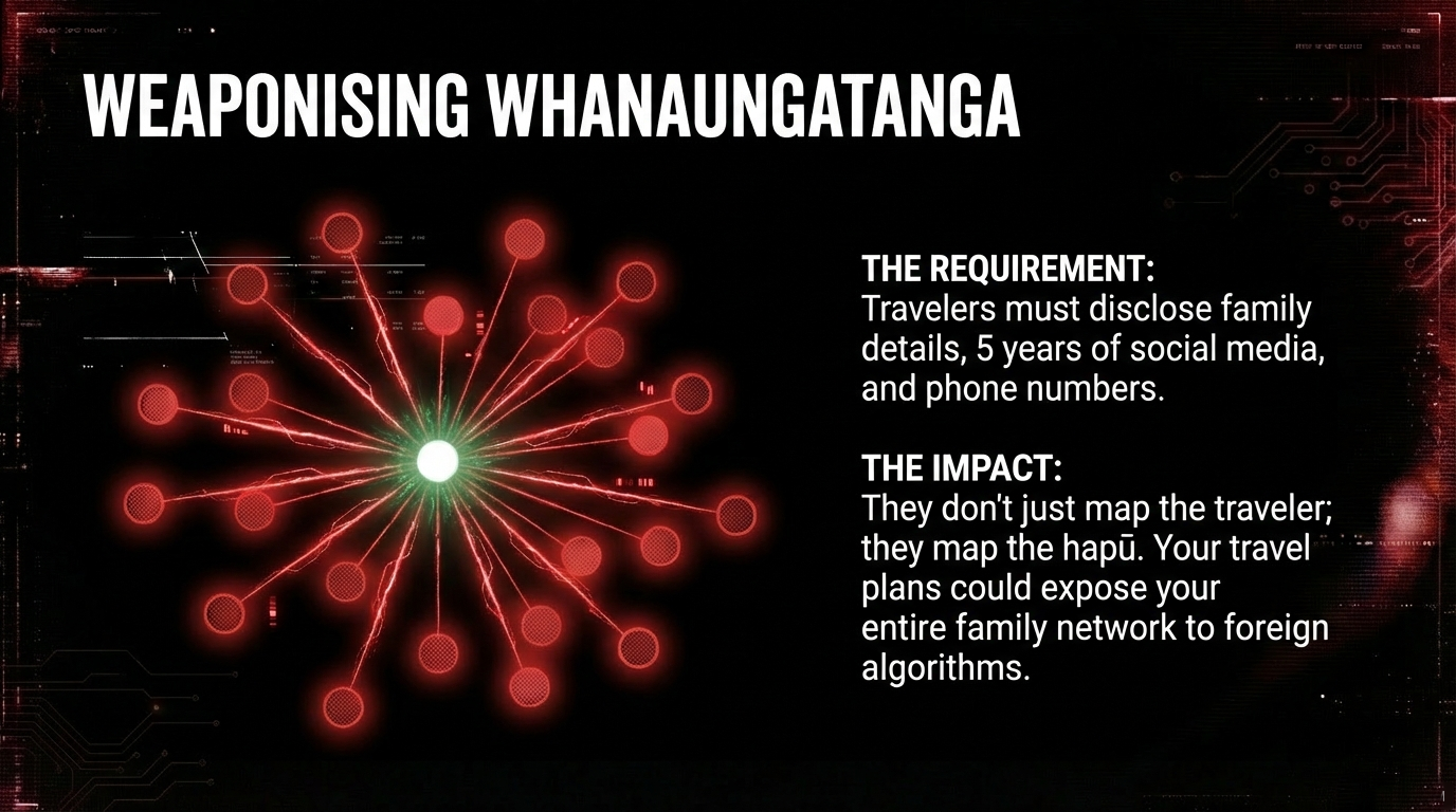 The EBSP Danger: A single Māori woman travelling to the US for a kapa haka festival provides her family details on the ESTA form. Under an EBSP with full database access, ICE's system cross-references those names against NZ Police databases. Her brother — who was wrongfully stopped and photographed by Police as a teenager — now appears in a network map generated by Palantir's targeting algorithms. Her cousin, who overstayed a US visa fifteen years ago, creates a further flag. The entire whānau is now a "pattern" in a system designed to identify threats.