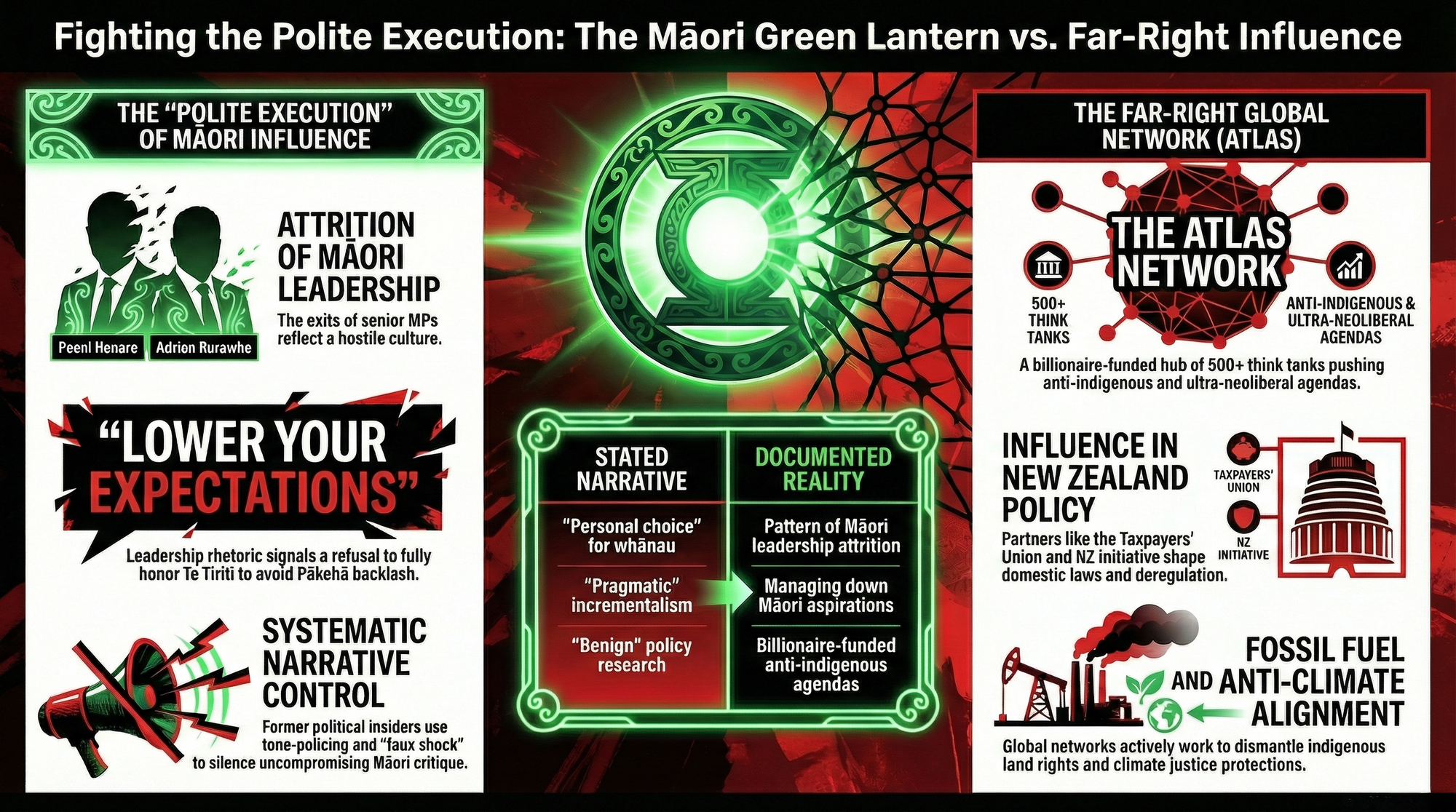 I reject that outright. My work is doing exactly what it was designed to do. As I wrote in “The Māori Green Lantern: Manifesto of Power—Why Position #79 Matters”, this kaupapa exists to quantify harm, name names, and expose how colonial media and party structures manage Māori dissent. Darien Fenton’s reaction does not show I am off‑base; it shows I am on target. It confirms that when a Māori commentator speaks with uncompromising clarity about Labour’s treatment of Māori – from Hipkins’ message to iwi, to the “polite execution” of Māori influence, to the exits of Henare and Rurawhe – the first instinct of some former insiders is still to control the narrative, not to confront the harm.