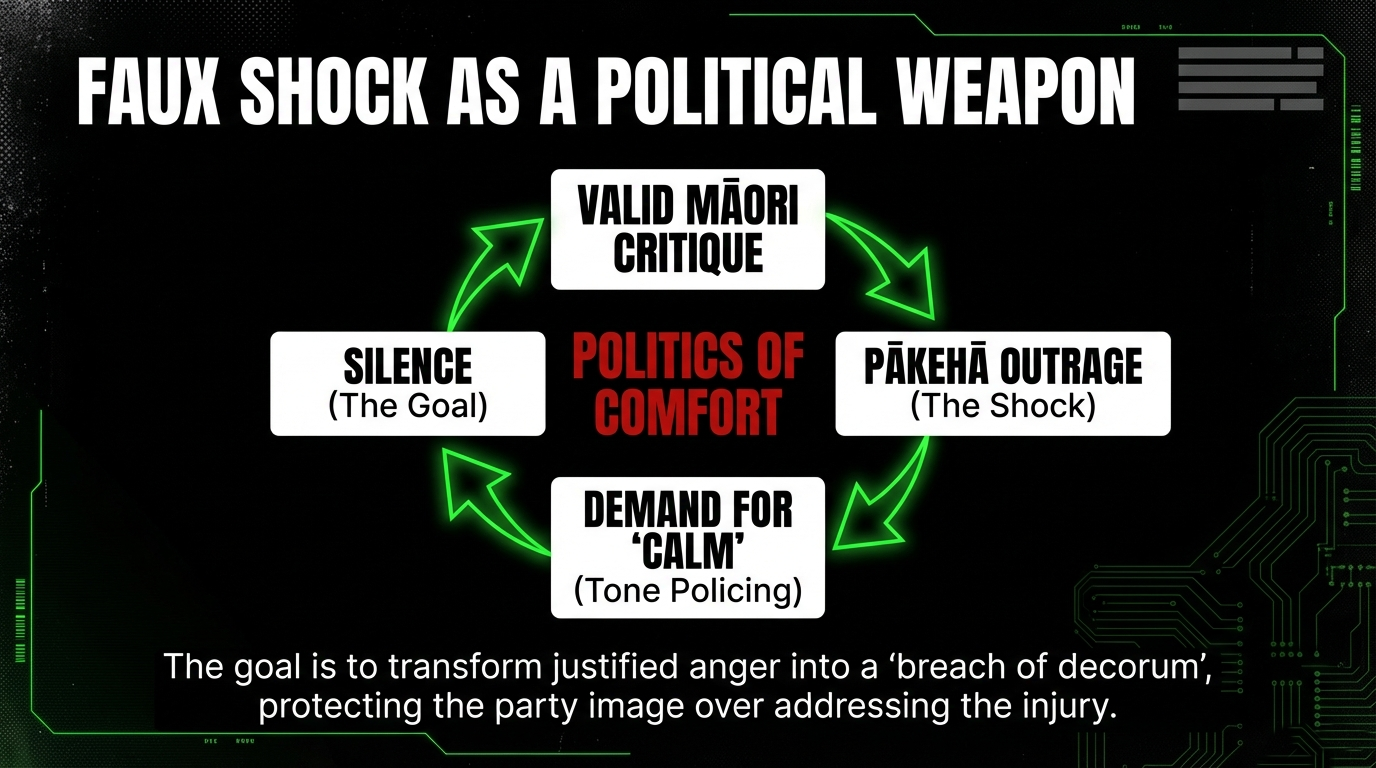 That is why I say her “shock” is faux. Real shock would be followed by reflection: “Why did my comment land that way? What power am I bringing into this space as a former Pākehā MP? How does this look to Māori readers?” Faux shock is a tactic. It exists to flip the script, to transform justified Māori anger into a breach of decorum, and to re‑centre Pākehā feelings as the real injury. In that sense, her reaction is not separate from Hipkins’ Waitangi line; it is the micro‑level version of the same politics of comfort.