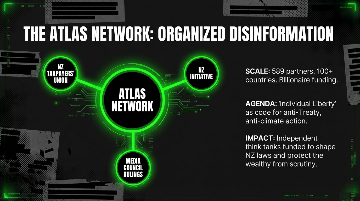 Even the media oversight bodies can feel the pressure. When TVNZ’s Mata Reports investigated Atlas’ role in undermining indigenous rights and the Treaty in Aotearoa and Australia, the Atlas Network’s CEO complained to the New Zealand Media Council. The Council found TVNZ’s factual claims were robust and well‑defended, but still upheld a narrow complaint about fairness for not inviting Atlas to respond, effectively reinforcing the expectation that this billionaire‑backed network must be given a respectful platform when criticised, as summarised in the Council’s ruling reported by 1News.