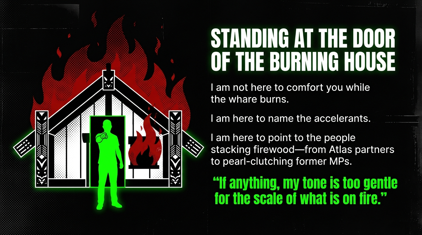 So if you find my tone too harsh, too bad. I am not here to comfort you while the whare burns. I am here to show you the exits, to point to the accelerants, to name the people stacking firewood – from Atlas’ local partners to the ministers fronting anti‑Māori legislation to the former MPs clutching their pearls in my comment section.