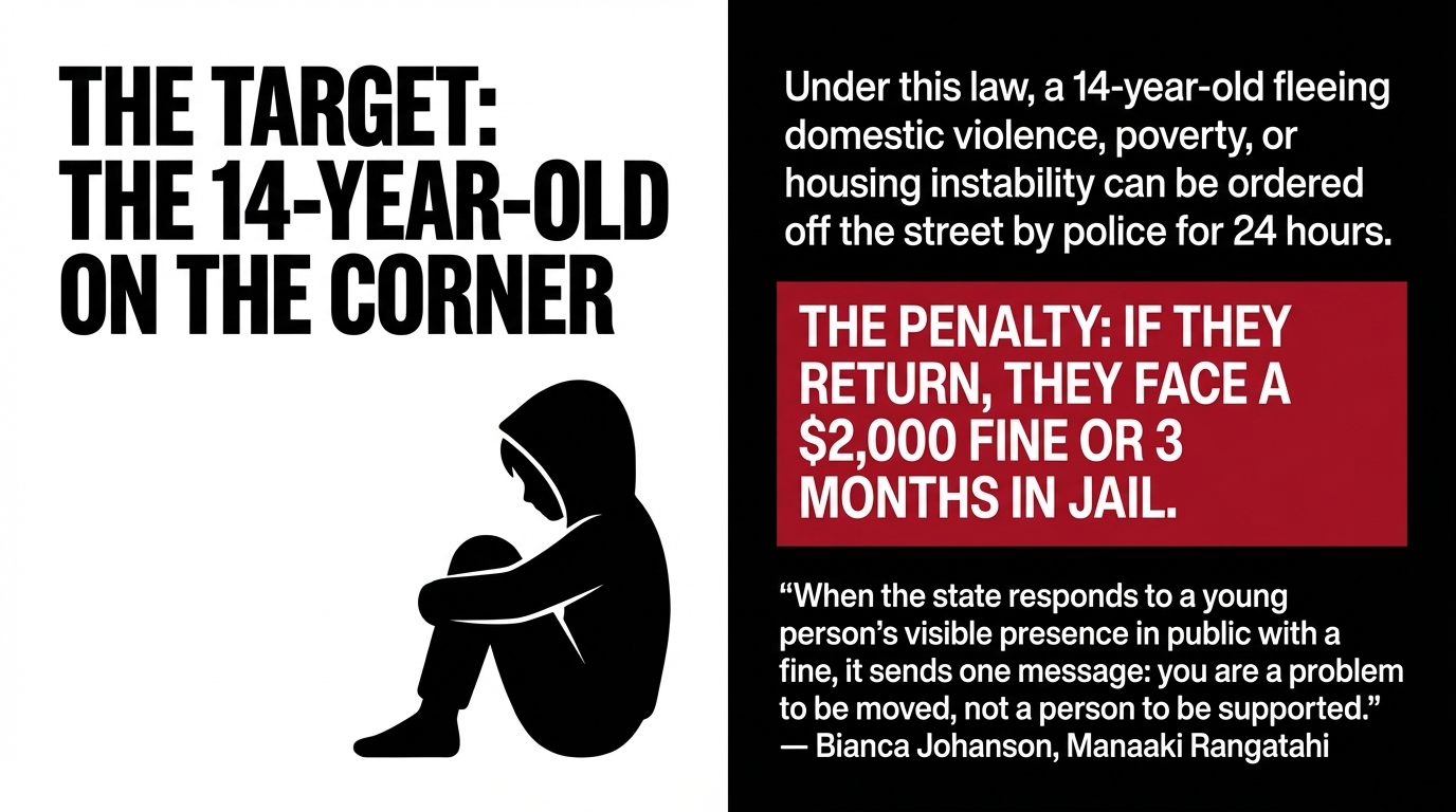 under these proposed amendments, a 14-year-old Māori child — who has fled domestic violence, whose whānau home is overcrowded, who has nowhere else to go — can be issued a formal police order to leave a public space for 24 hours. If they return — because they have nowhere else to go, because they are 14 and it is raining — they face a $2,000 fine or three months imprisonment.