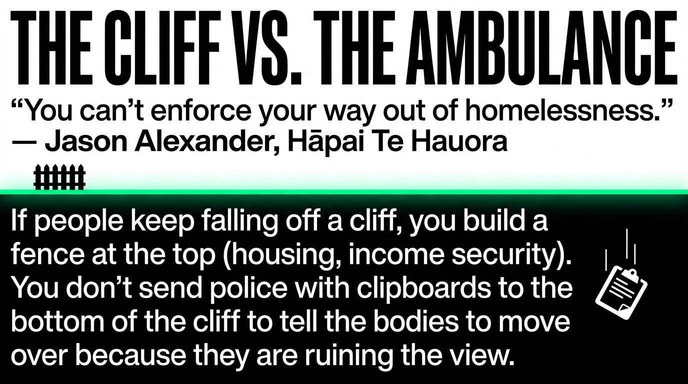 If people keep falling off a cliff, you put a sign — a barrier, a fence — at the top. You don't just keep dispatching ambulances to pick up bodies at the bottom. As Jason Alexander explained to RNZ: "With this policy, it's sort of like they've already fallen off the cliff — that's them being homeless — and now the police are coming along and asking them to move over a bit because we don't want to see it."