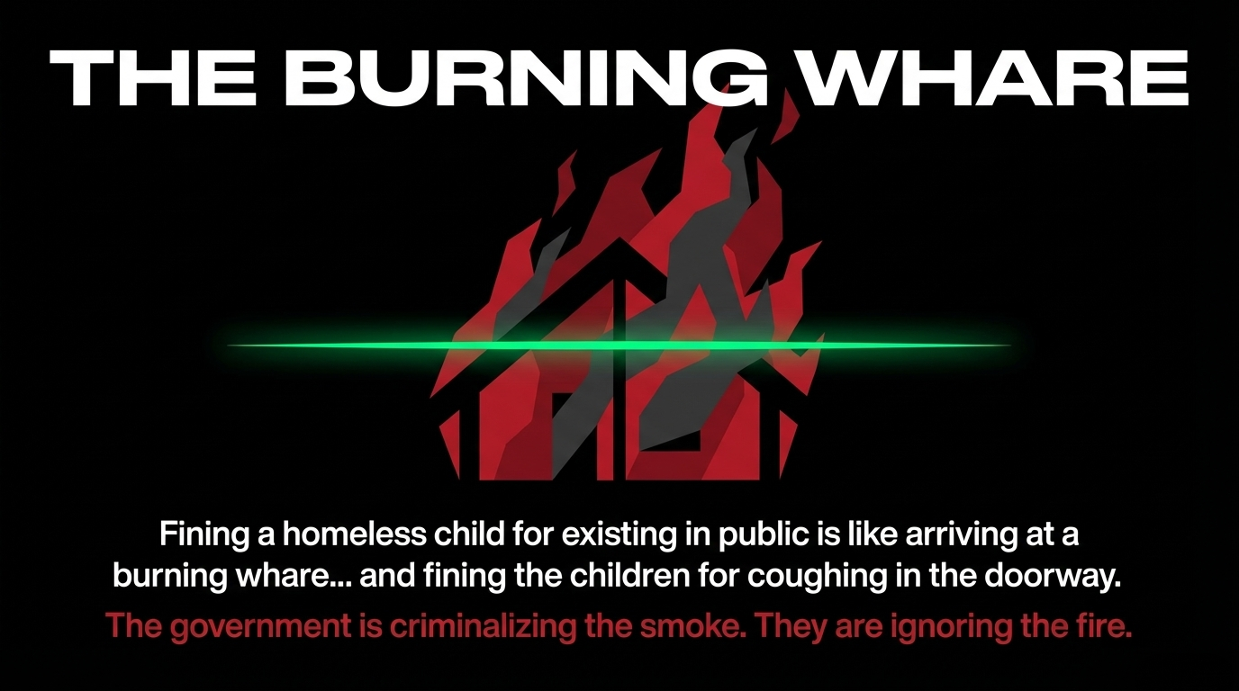 Imagine a whānau whose house is on fire. The smoke billows from the windows. Children are visible at the door, choking. The fire department arrives — not with a hose, but with a clipboard and a fine.