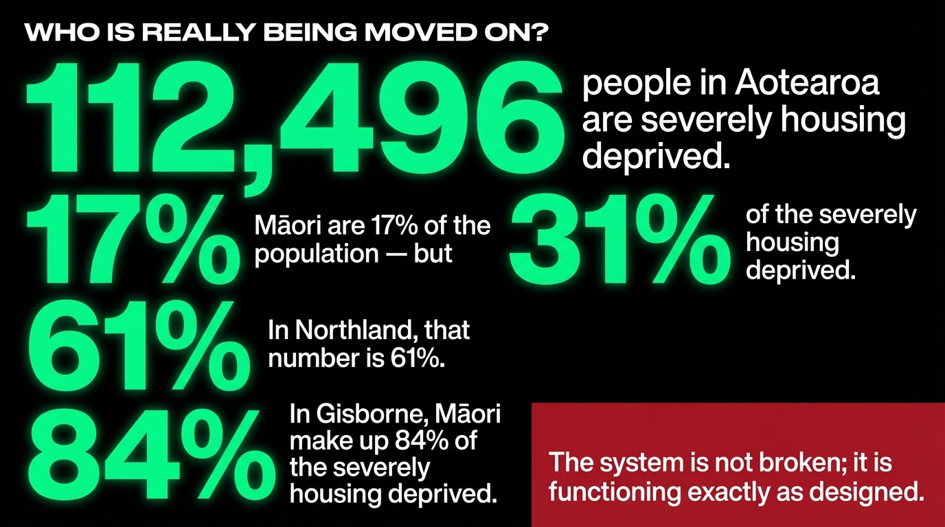 This government will not fix this. That is not a pessimistic forecast. It is an empirical observation. The ideological DNA of this administration — the same neoliberal whakapapa that gave us the Mother of All Budgets, Kāinga Ora's gutting, benefit cuts, and now move-on orders — does not contain the instructions for housing the poor. It contains the instructions for hiding them.