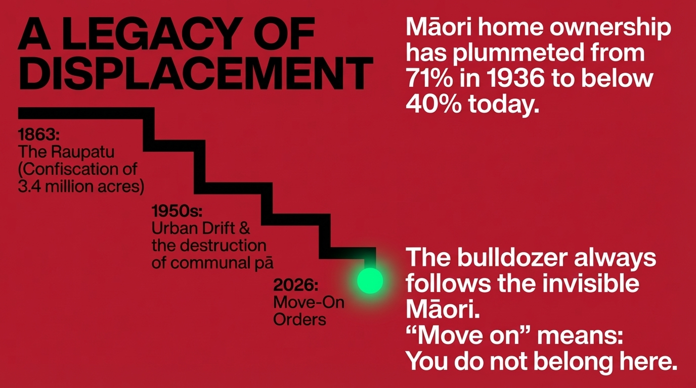 The Crown's Move-On Orders Are Not Law Enforcement — They Are Aesthetic Enforcement. The Bulldozer Has Always Followed the Invisible Māori.