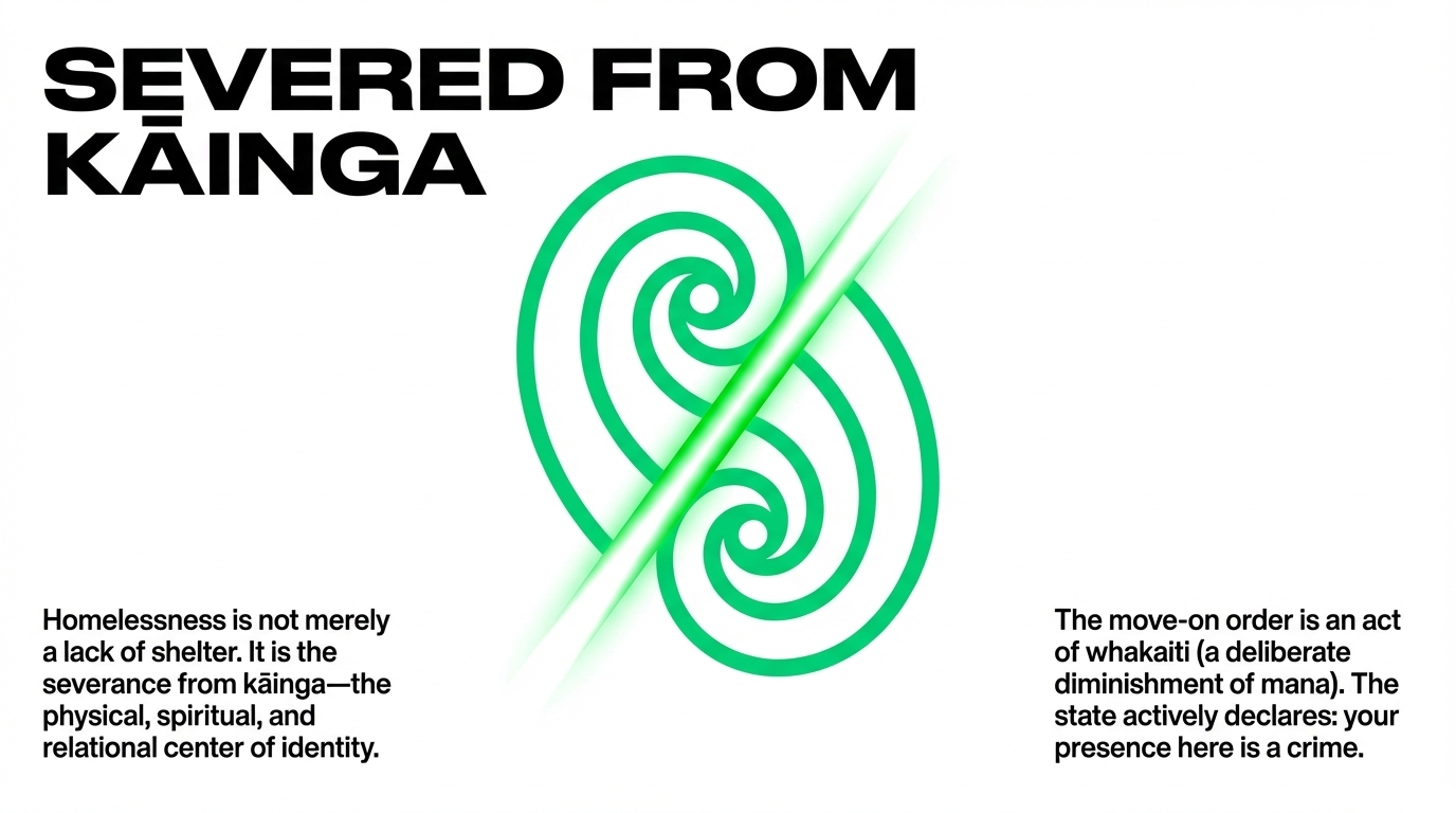 The move-on order is, in tikanga terms, an act of whakaiti — a deliberate diminishment of mana. It is the state telling our rangatahi: you have no mana here. You have no right to exist here. Move. And it is delivered by a government that simultaneously gutted the Māori Housing kaupapa funding model, restructured Kāinga Ora into a liability-management operation, and delivered a budget in which not one child poverty target was met.
