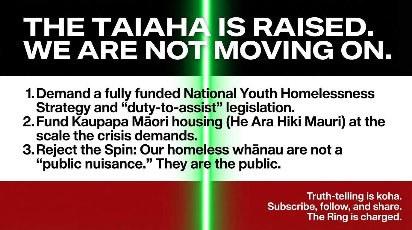 While this government moves our homeless whānau on from public view, it will not move the truth from these pages. Every move-on order issued to a cold 14-year-old on a Tauranga footpath is a data point this mahi will record. Every Māori whānau shuffled out of sight so Goldsmith's donors can eat undisturbed is a harm this Ring will name.