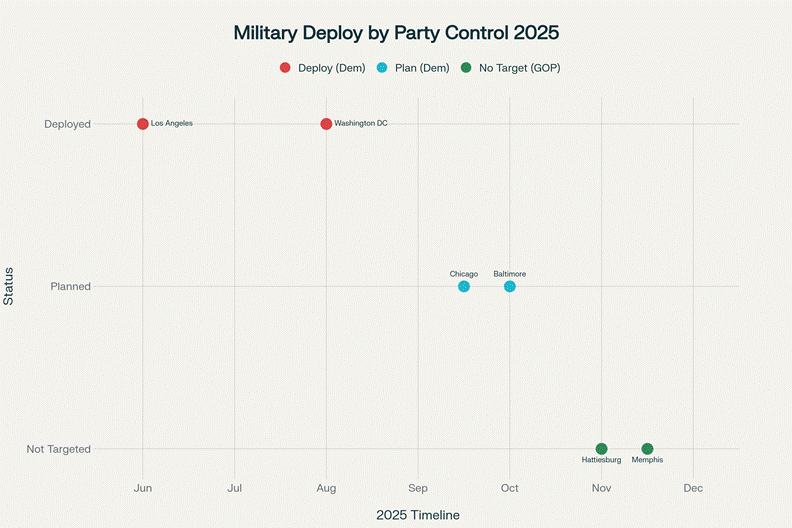 Donald Trump is not simply deploying federal troops to American cities - he is orchestrating the methodical transformation of the United States into a full military police state, deliberately targeting Democratic strongholds while protecting Republican territories with higher crime rates. This calculated pattern exposes the manufactured nature of his "law and order" campaign and reveals the deeper authoritarian project at work: the systematic dismantling of democratic governance through militarized occupation of dissenting communities.[1]