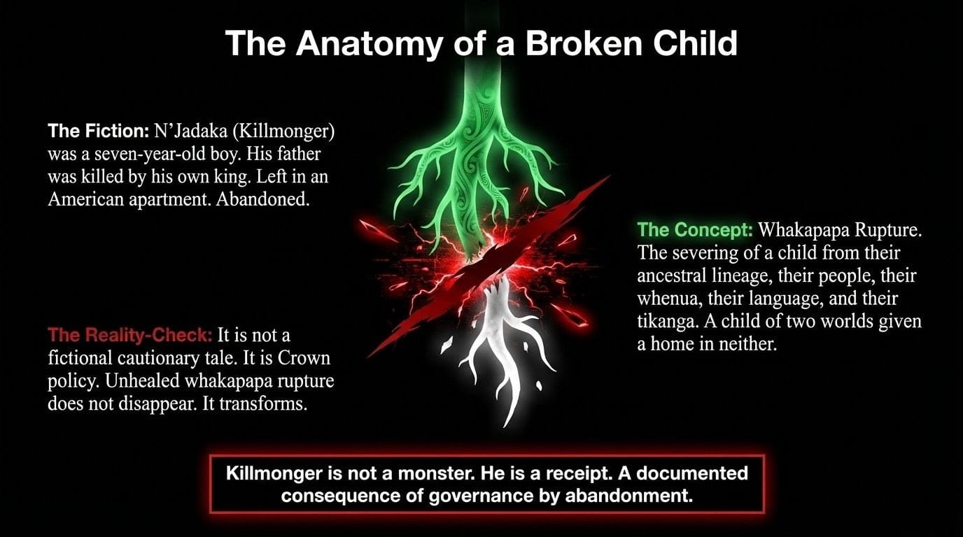 N'Jadaka became Killmonger because the doors stayed closed too long. Because the resources existed and the connection was withheld. Because the Crown — in Wakanda, as in Aotearoa — killed the father and left the child to make sense of the wreckage alone.