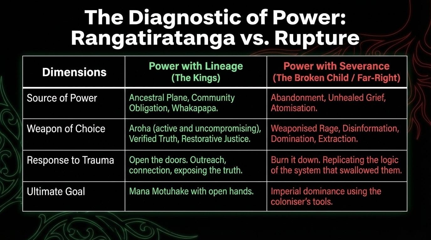 As The Butcher, the Baker and the Blackmail Maker documents — accountability is generational. You cannot claim the inheritance of rangatiratanga while ignoring the inheritance of harm.