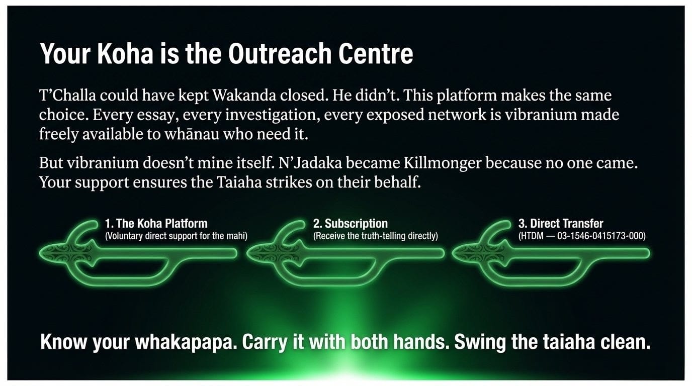 And the Māori Green Lantern does not seek to burn Wakanda down. He seeks to open its doors. Every essay is an outreach centre. Every verified citation is a piece of vibranium made accessible to whānau who need it. Every named network, every exposed connection, every quantified harm is T'Challa's choice enacted in real time: not isolation, not domination — mana motuhake with open hands.