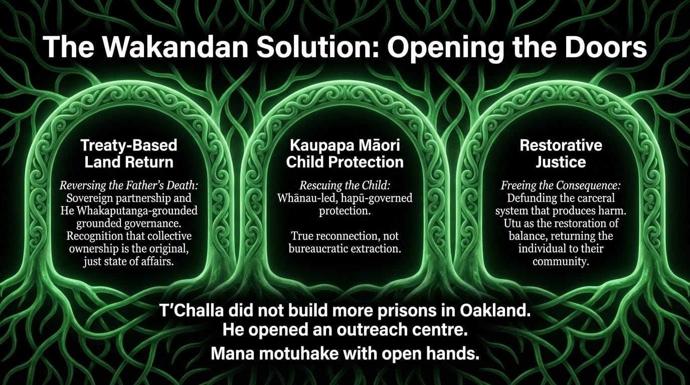 The solution T'Challa modelled: Reconnection — not charity. He established the first Wakandan International Outreach Centre in Oakland — precisely the city where N'Jadaka grew up unsupported, as confirmed in Understanding T'Challa's Decision to Open Wakanda to the World. The solution for Aotearoa is whānau-led, kaupapa Māori child protection — funded adequately, governed by hapū, not managed by a Crown bureaucracy that produces the harm it claims to fix.