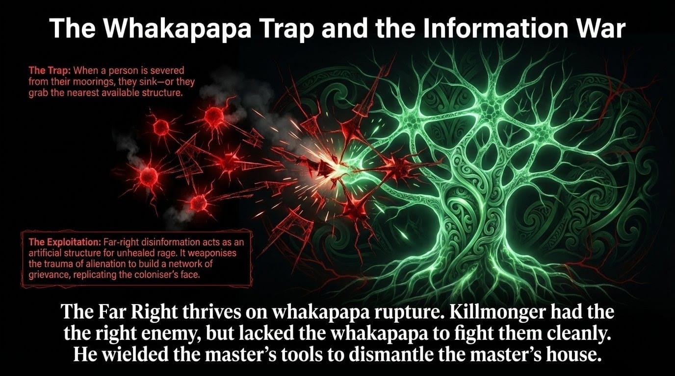 This is the whakapapa trap. When a person is severed from their ancestral moorings, they do not float free. They sink — or they grab the nearest available structure to hold onto.