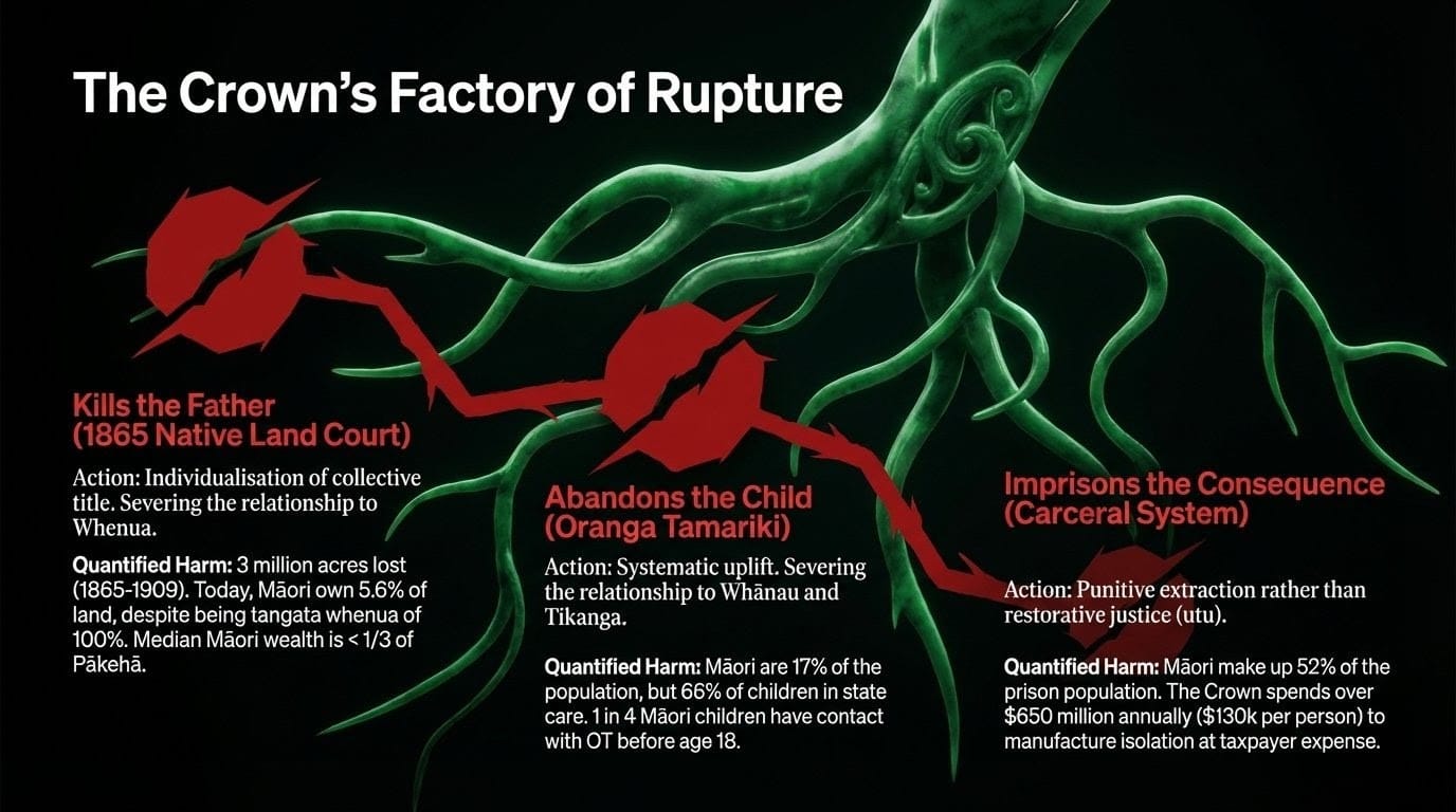 This is the tikanga violation for the Western mind: Imagine you were adopted at birth into a family that spoke a language you were forbidden from learning, that practised a religion refusing to acknowledge your original faith, that systematically erased every cultural marker connecting you to your biological ancestors — and then, at eighteen, handed you a piece of paper saying: "By the way, you are Irish." The grief of that incomplete return. The rage of that severing. That is what Oranga Tamariki does to Māori children systematically, at scale, as policy.
