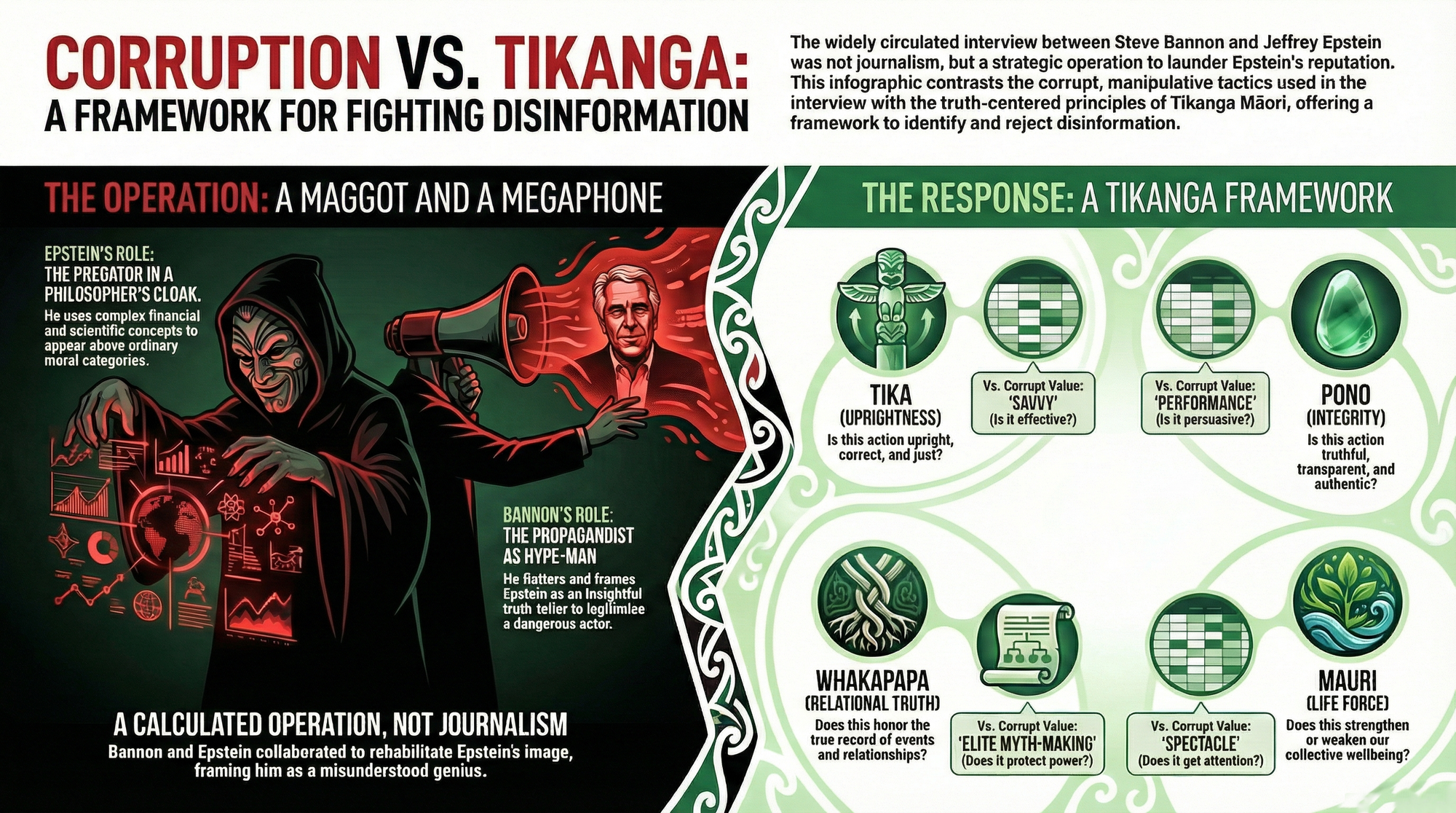 For western institutions, tikanga is not a decorative addon; it is a counter‑code to the corruption embodied by Bannon and Epstein.