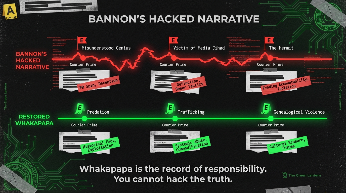 This essay exists because the Crown and corporate media left a vacuum. The DOJ only opened the vault after years of pressure; elite outlets gave Bannon and Epstein space long before they gave survivors the same. Every minute spent unpacking their operation through tikanga is unpaid labour unless whānau choose otherwise.