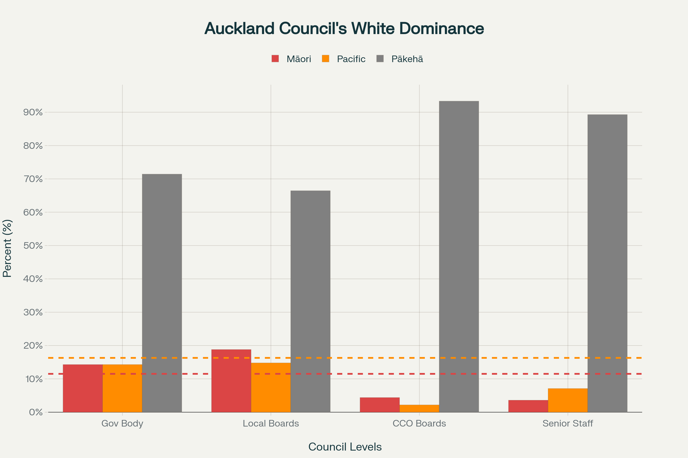 The Council-Controlled Organisation boards - where the real power lies in Auckland’s fragmented governance system - show even worse exclusion. Māori hold just 4.4% of CCO board positions while Pacific peoples hold 2.2%, creating gaps of 7.1 and 14.1 percentage points respectively. These are the boards that control Auckland Transport, Watercare, and other key services affecting daily life.