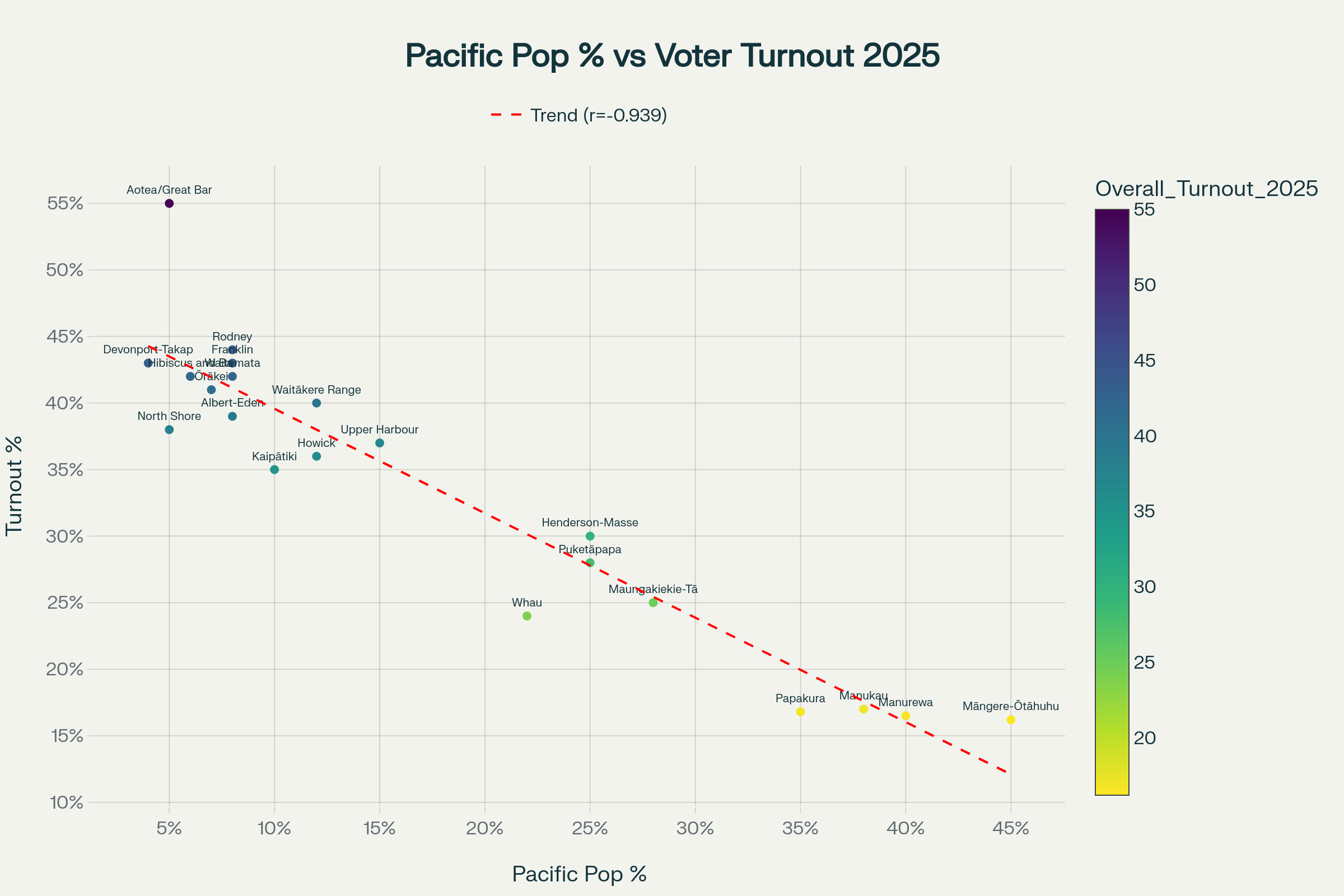 Auckland’s 2025 election reveals how colonial democracy functions as minority rule disguised as majority choice. The correlation between ethnicity and voter exclusion isn’t accidental - it’s architectural. Our analysis of turnout data shows a devastating -0.939 correlation between Pacific Island populations and voter participation, meaning the more Pacific families live in an area, the less likely anyone there is to vote.