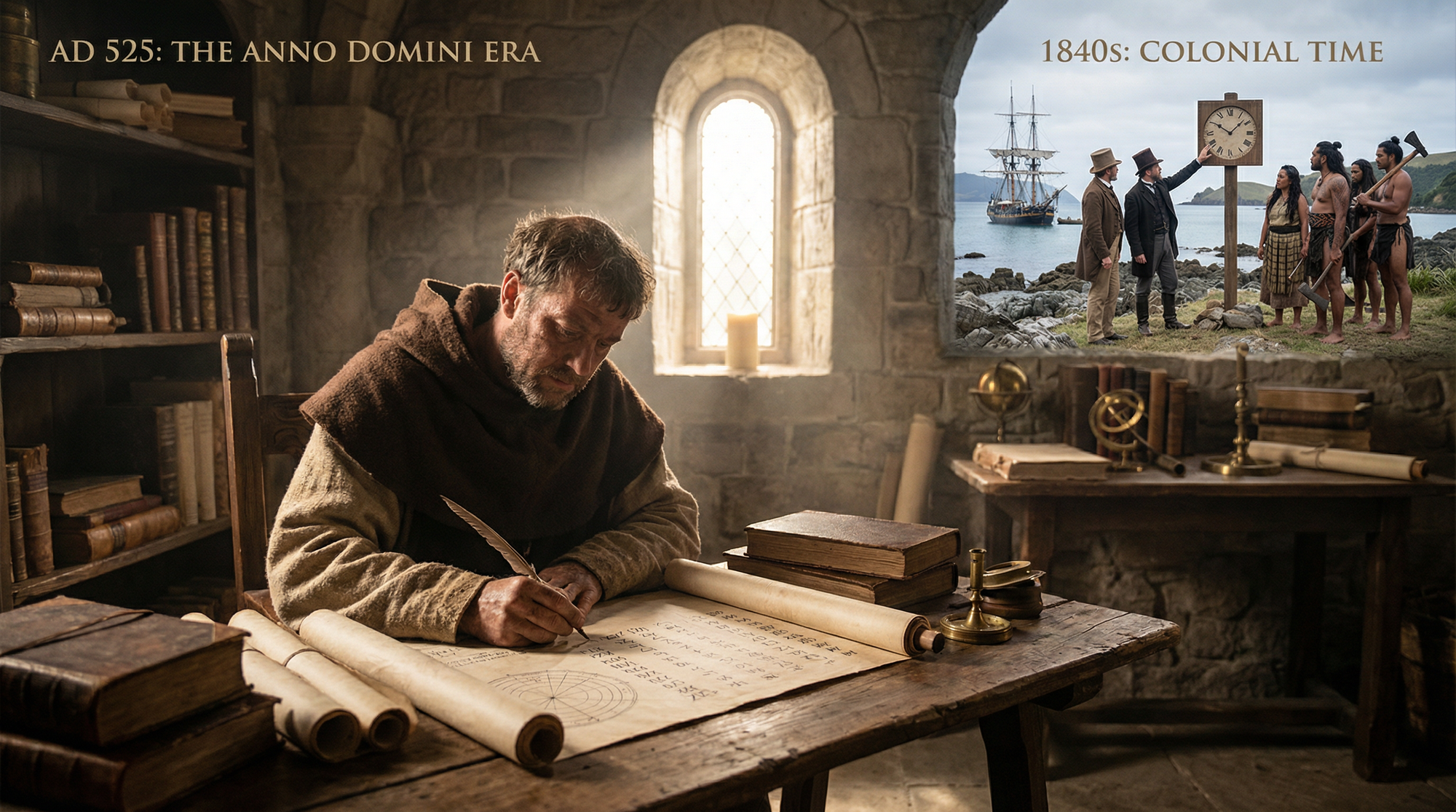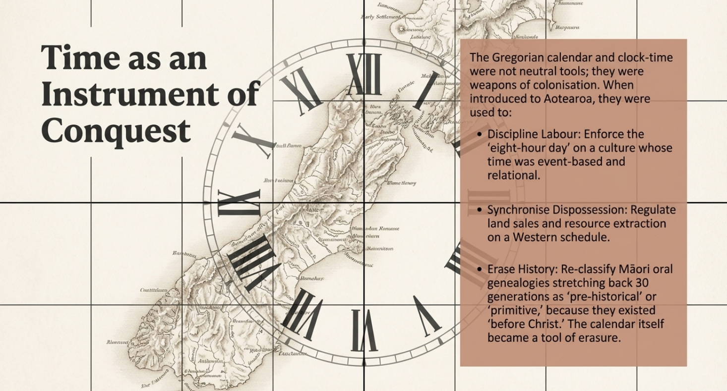 The BC/AD system spread through Europe, then through colonial conquest. By the time European powers colonised the Pacific, the BC/AD convention had become so naturalised that it appeared to be simple fact, not a deliberate Christian imposition. When British settlers arrived in Aotearoa, they brought their Gregorian calendar, their “Anno Domini” system, their linear clock-time—and used these technologies to regulate Māori labour, to synchronise the dispossession of Māori lands, to enforce the “eight-hour day” that European workers had fought for. The calendar itself became an instrument of colonisation.