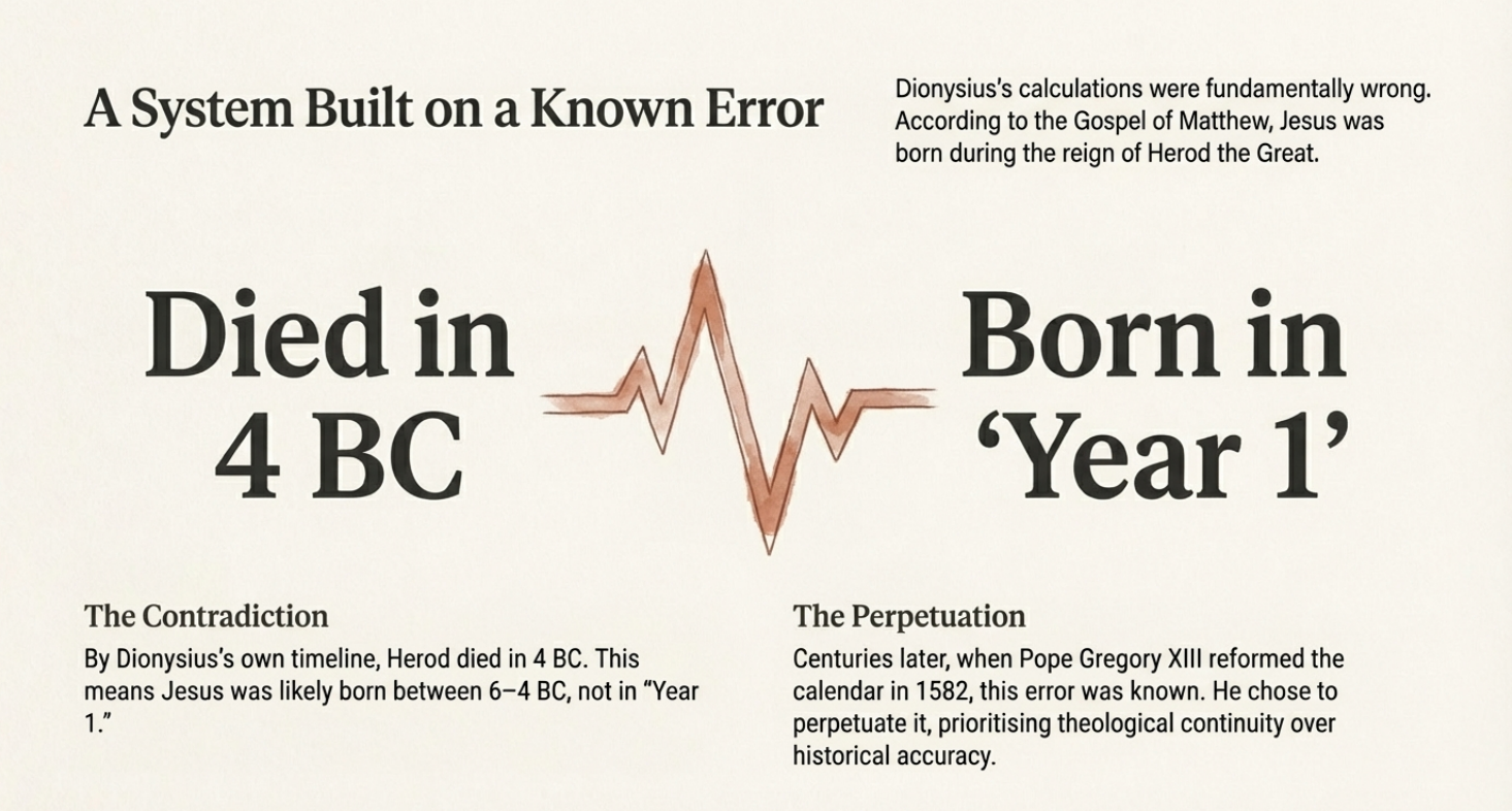 Dionysius made catastrophic errors. Herod the Great, under whom Jesus is said to have been born according to Matthew’s gospel, died in 4 BC by Dionysius’s own calculations. This means Jesus was likely born between 6-4 BC, not in “Year 1.” Yet when Pope Gregory XIII reformed the calendar in 1582, three centuries after Dionysius’s death, he knew of these errors but chose to perpetuate them, perhaps—as scholars note with dark humour—hoping no one would notice.