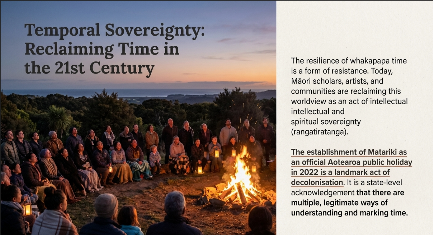 The resilience of Māori temporal concepts despite centuries of suppression is remarkable. Even now, when nearly every institutional clock in Aotearoa displays time in AD/BC notation, Māori scholars, artists, and communities are reclaiming whakapapa-based temporality as a form of intellectual and spiritual sovereignty.