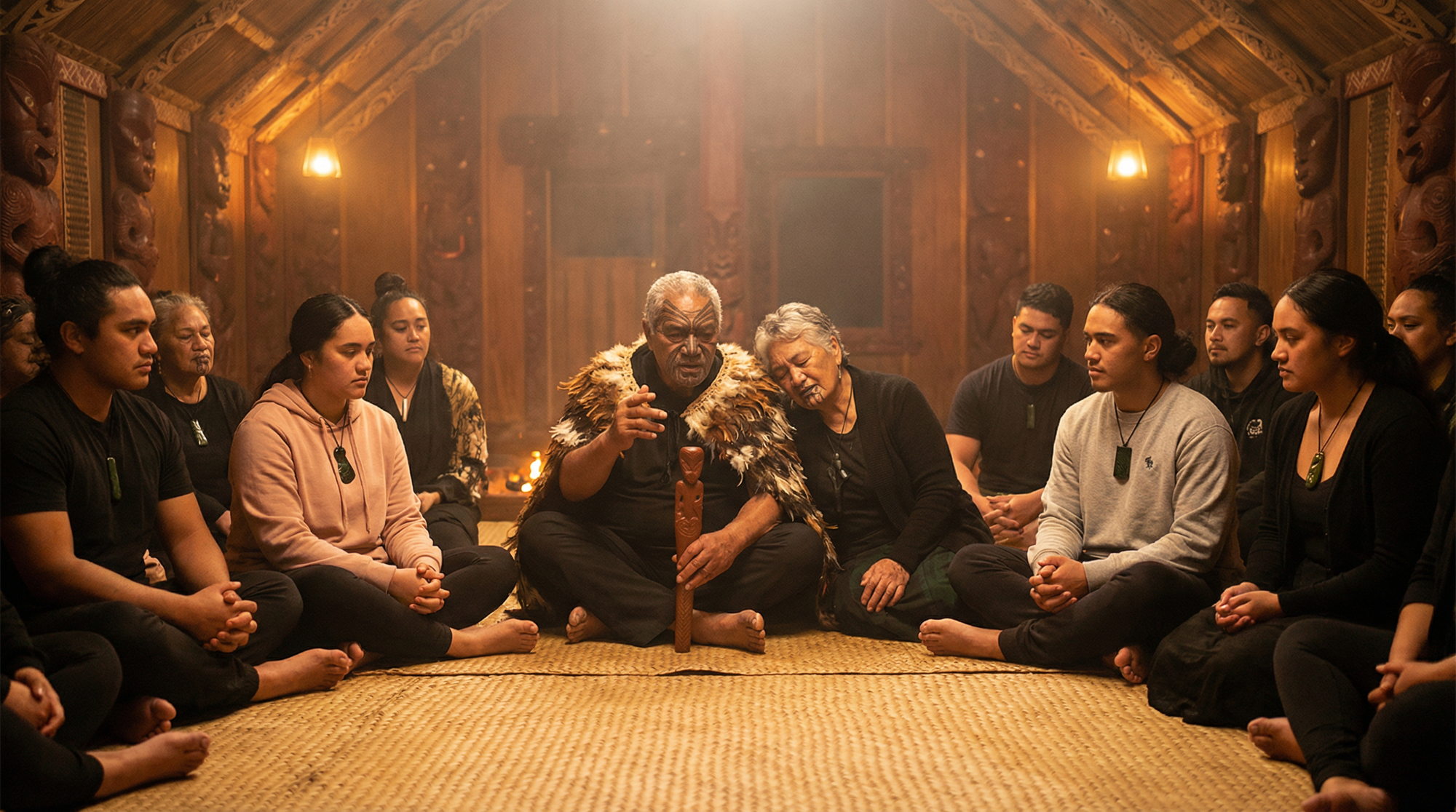A Māori hui (gathering) operates in whakapapa time. Participants sit in a circle—not incidentally, but by design—because the circle holds all generations at once. The kaumātua (elders) carry the knowledge of tūpuna, literally channeling ancestral perspectives into the room. The young people present embody the mokopuna who will inherit the consequences of today’s decisions. The words spoken are not new inventions but amplifications of conversations that began generations ago and will continue long after the current speakers are tūpuna themselves.