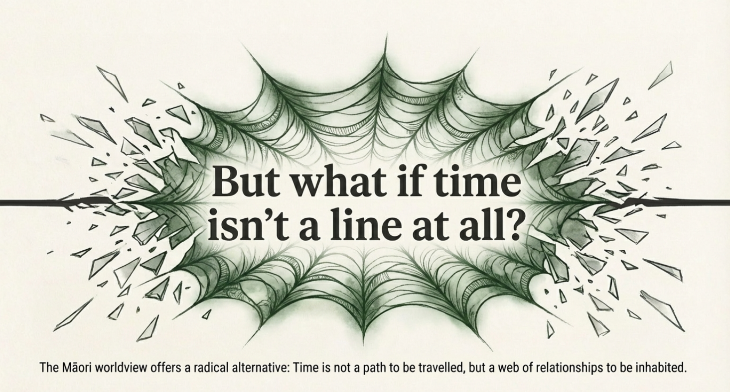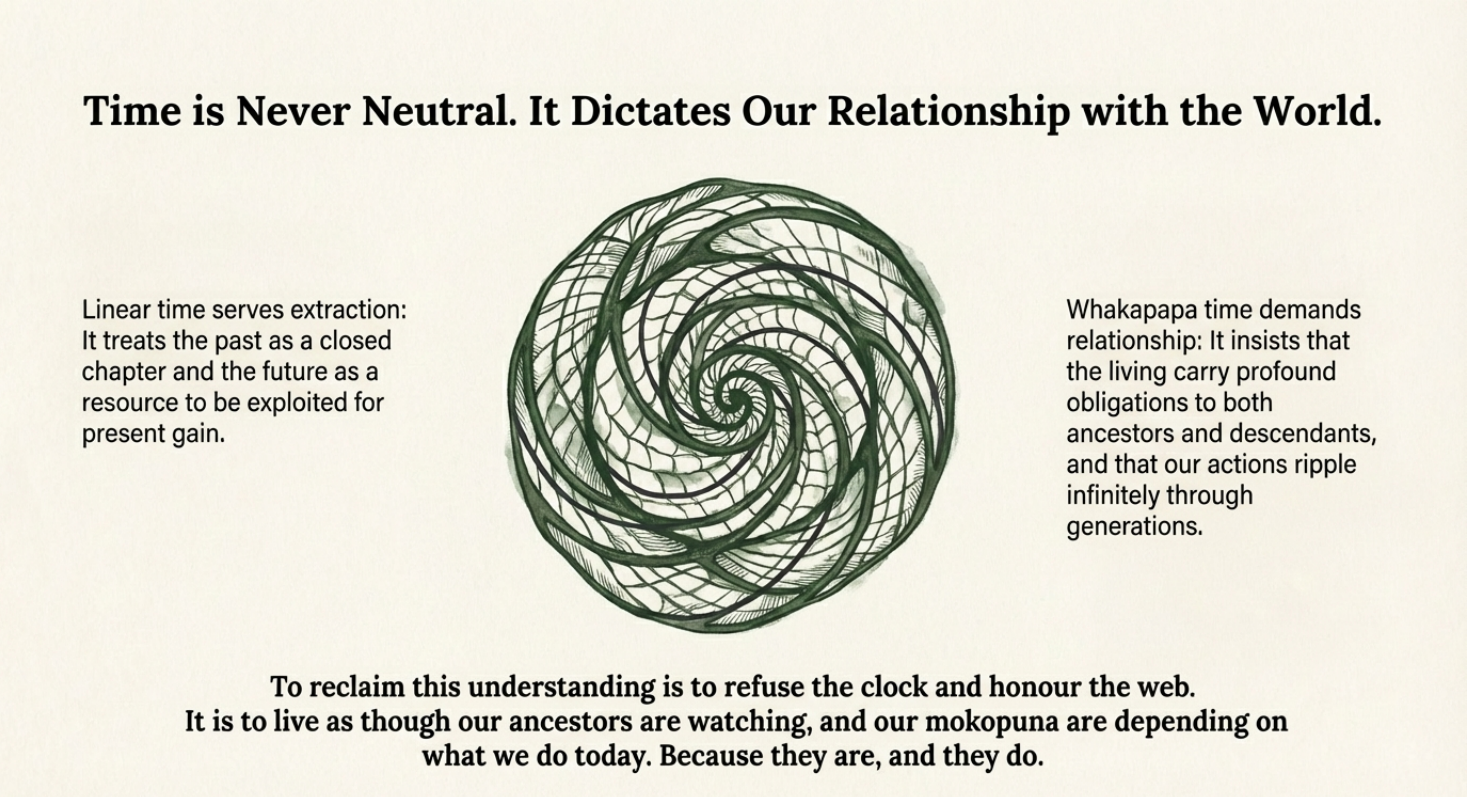 Similarly, Māori researchers are developing frameworks that integrate whakapapa time into health, environmental, and social policy. Rather than treating time as a scarce resource to be optimized (the industrial logic), or as an arena for progress (the Western narrative), these frameworks treat time as a relationship to be honoured, a genealogical web to be activated and maintained with integrity.