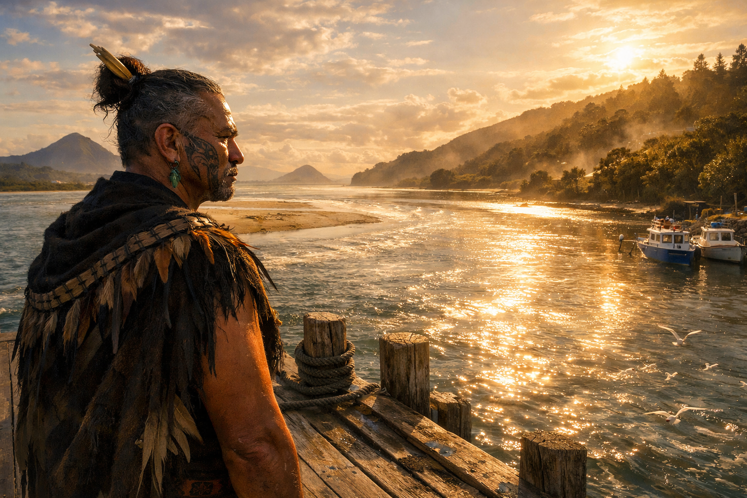 Now imagine a Māori observer standing at the same place. The river is not a sequence but a living whakapapa. The water flowing past contains the mauri (life force) of Hinemoana, ancestor goddess of the sea. That water carries the genealogy of rain that fell on mountains, conversations ancestors had beside this river, the pollen from flowers they planted. The future mokopuna will drink this same water, will swim in it, will have their identities shaped by it. The present moment—standing at the wharf—is not a point in time but a collapse of all these relationships into one place. You are standing in whakapapa itself.