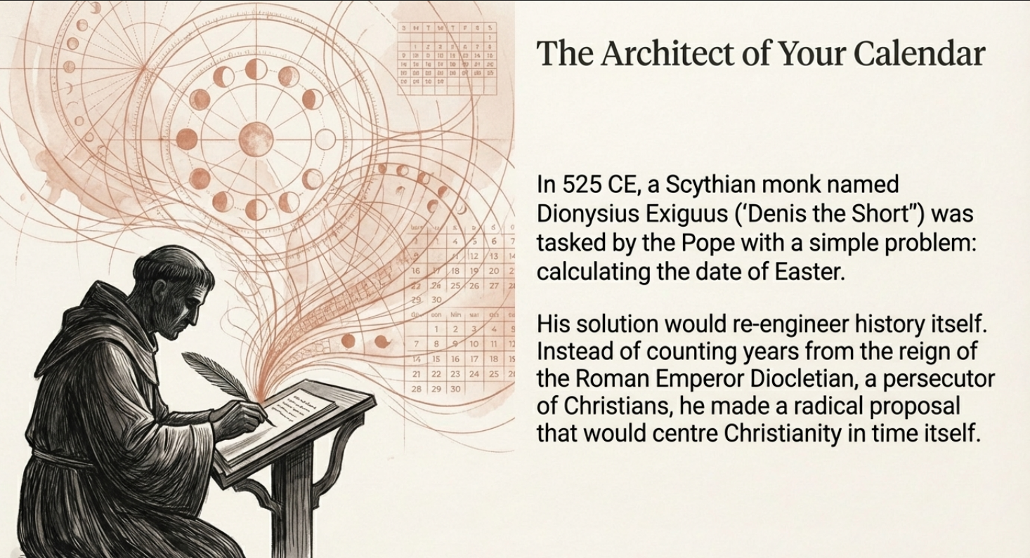 The Western world’s obsession with linear time was not inevitable. It was imposed through deliberate theological engineering. In 525 CE, a Scythian monk named Dionysius Exiguus (his name means “Denis the Short”) decided to reorganise the entire Christian calendar around the birth of Jesus. This decision, made in a monastery, would eventually colonise the timekeeping of billions.
