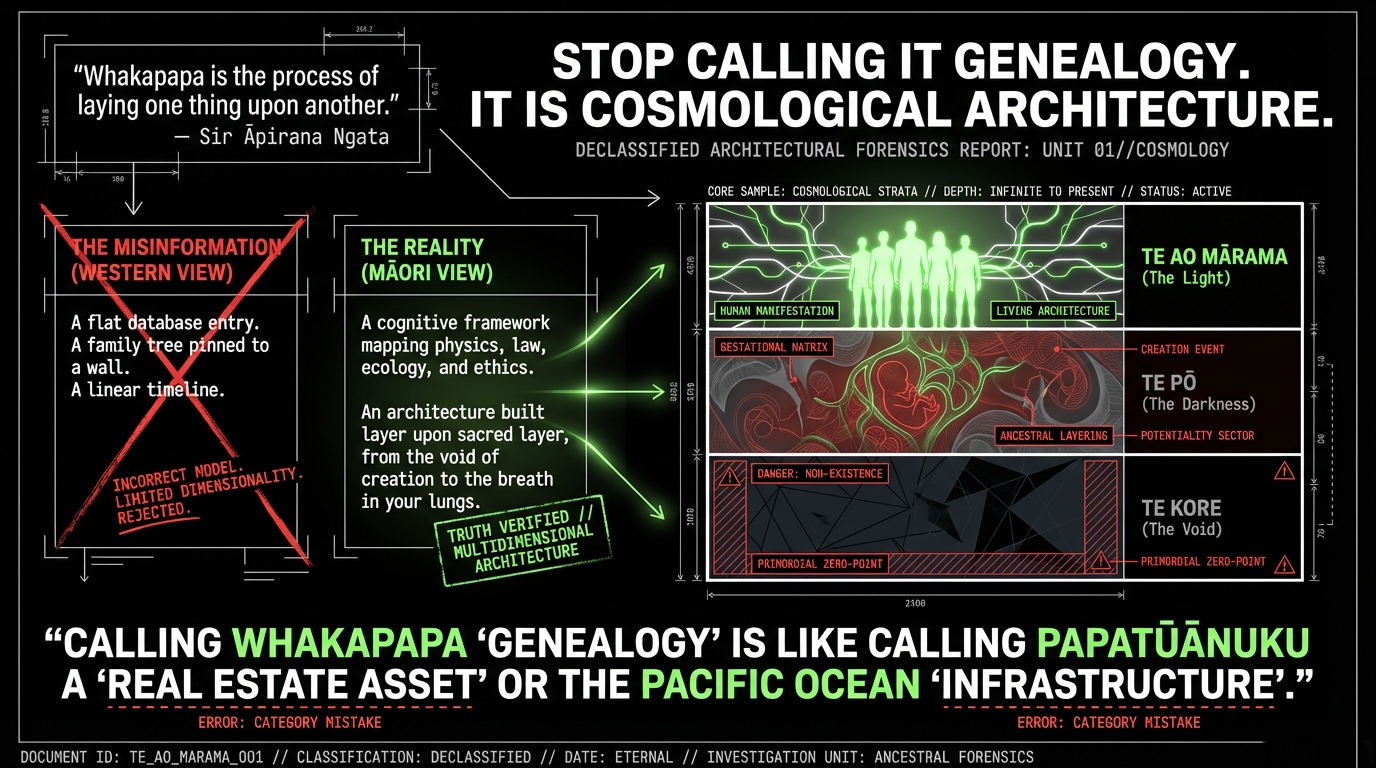 As Daniel Hikuroa writes: "Whakapapa is the central principle that orders the universe, demonstrates an interconnectivity between everything, and is a cognitive genealogical framework" (University of Auckland). Cognitive genealogical framework. Not a fairy tale. Not a cultural performance for corporate diversity workshops. A working framework for understanding reality itself.