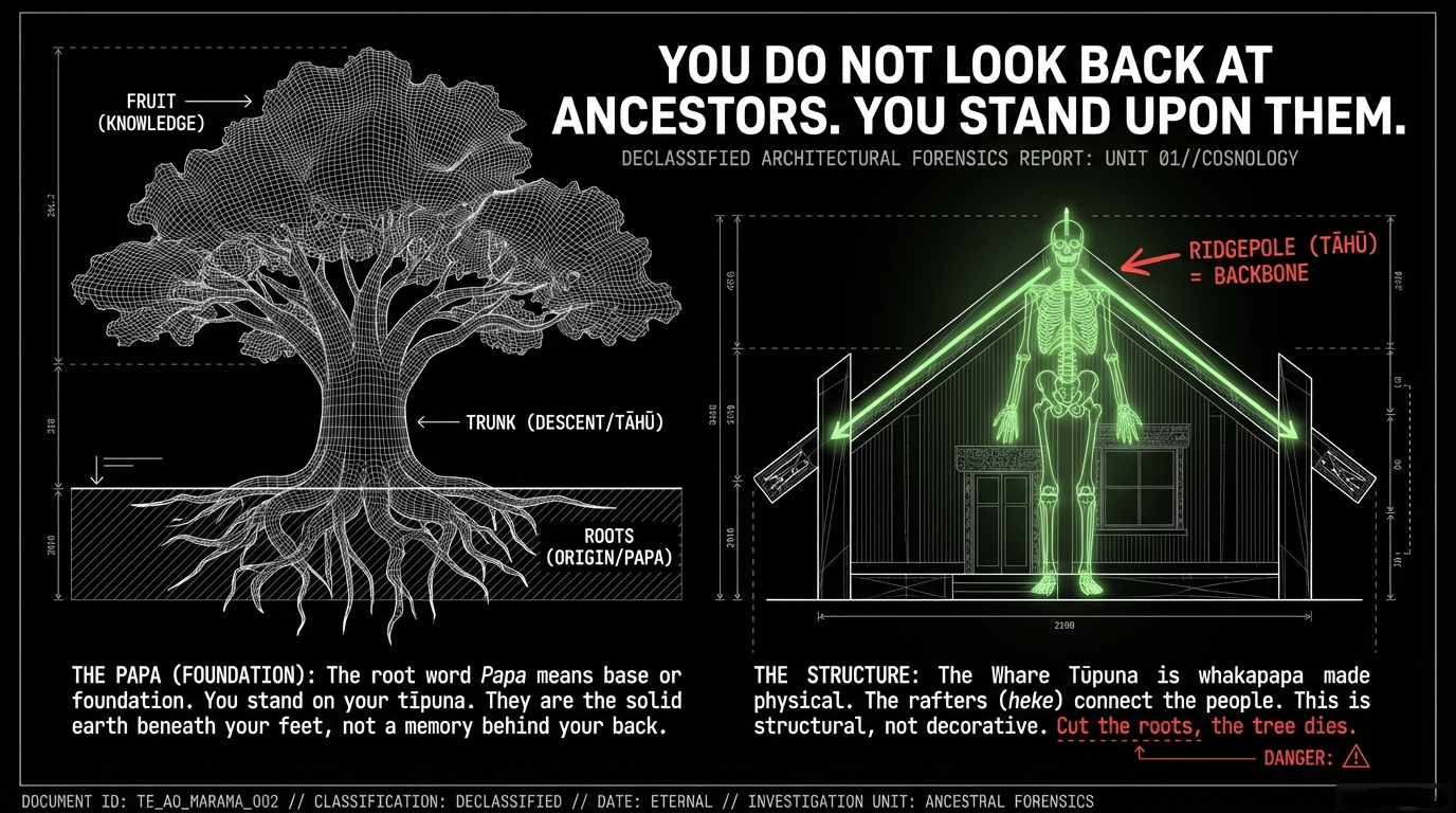 This is the ultimate whakapapa metaphor. The dead do not disappear. They become papa—foundation. They become the layer on which the living stand. The body returns to the womb of Papatūānuku: "Hoki koe ki a Papatūānuku, ki te kōpū o te whenua" (Urupā Tautaiao). The spirit ascends to the divine layer. The living stand on both. The architecture holds—unless someone demolishes it.