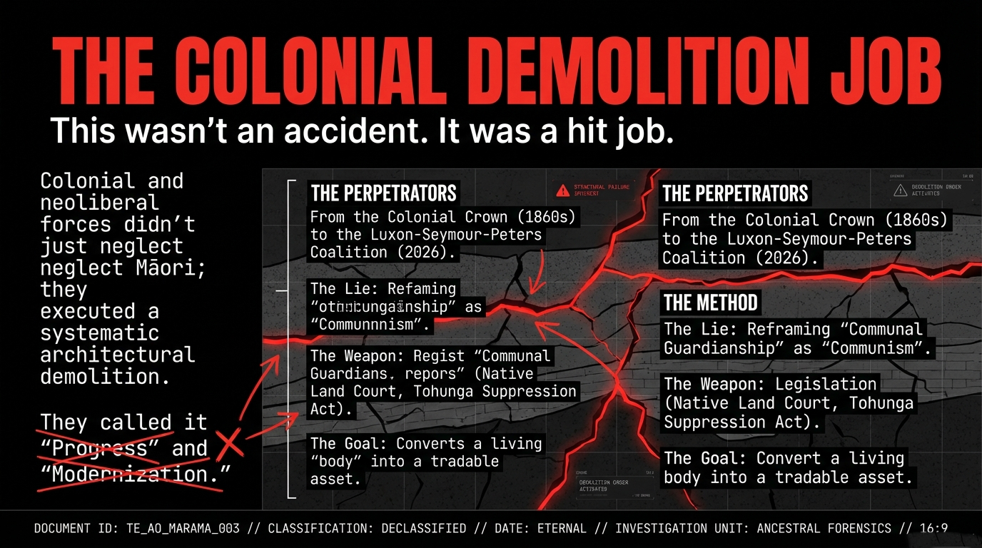 What colonisation did to whakapapa was not an accident. It was not neglect. It was not "well-meaning mistakes." It was architectural demolition—systematic, legislated, and profitable.