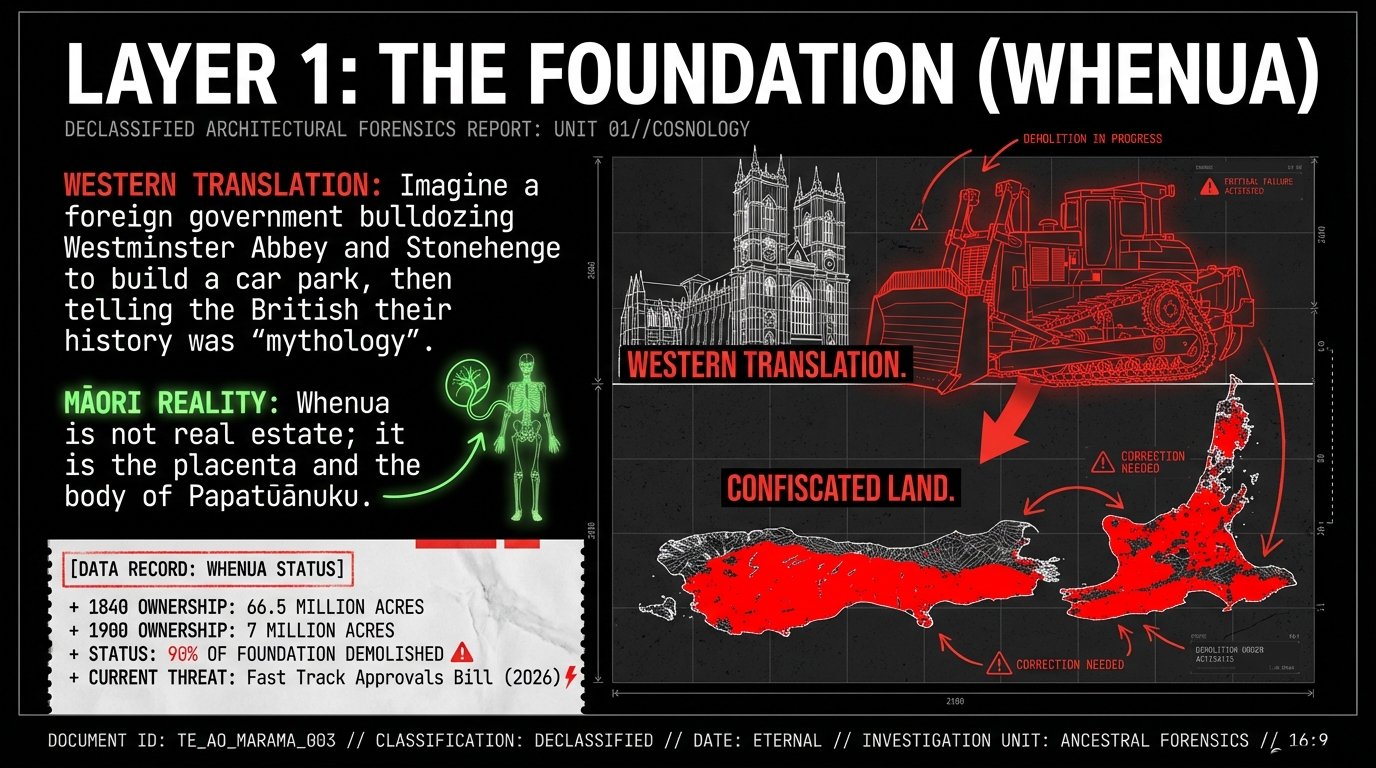 For the Western Mind: Imagine if a foreign government invaded Britain, passed a law converting every ancestral estate, every church graveyard, every village commons into individual titles—then made it trivially easy to sell them, rigged the process so most would be alienated within a generation, and then bulldozed Westminster Abbey, Canterbury Cathedral, Stonehenge, and every library in the country. Then told the British their history was "mythology" and their land tenure was "communism" that needed to be "reformed" into individual property rights. That is what the Native Lands Act 1862 and the Native Land Court did to Māori.