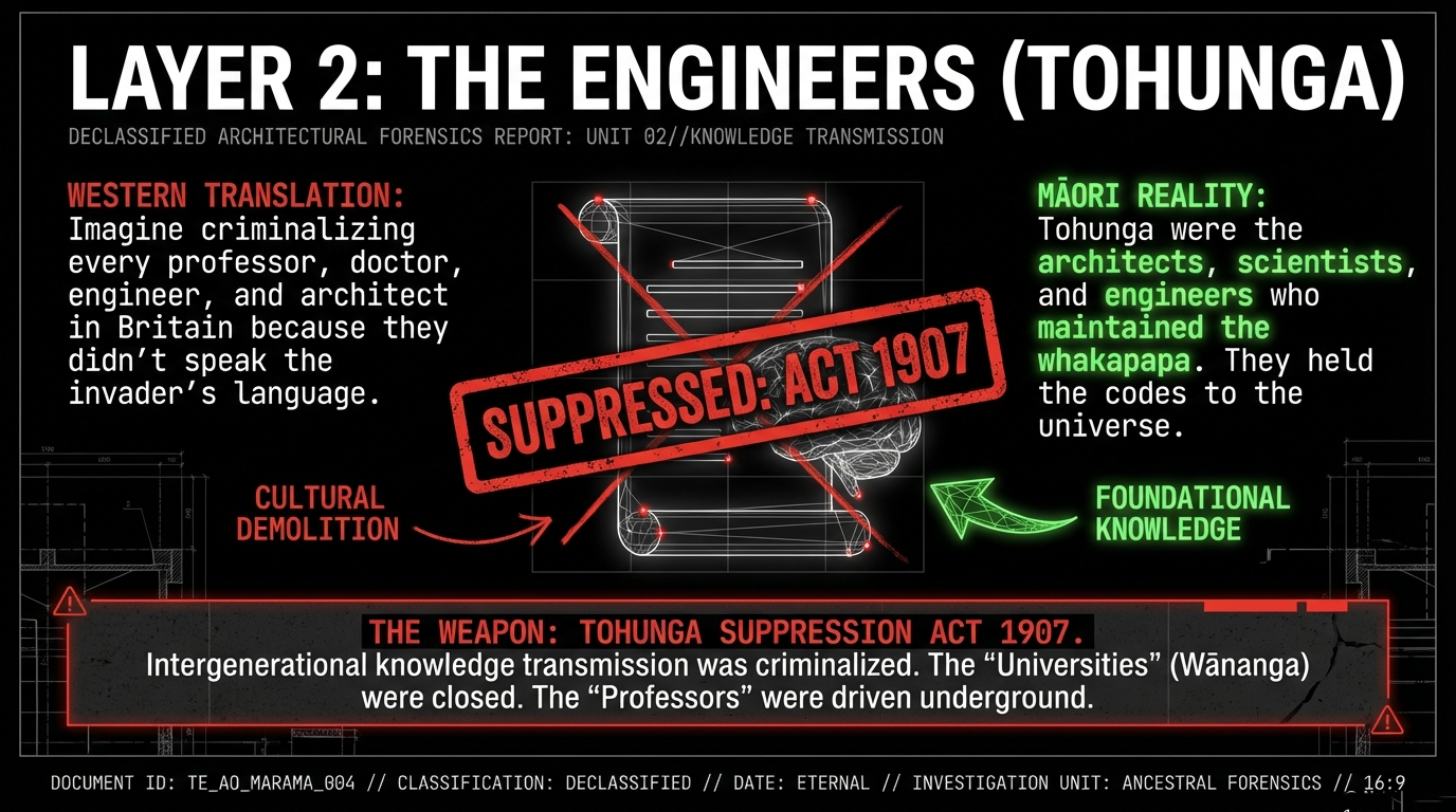 The Tohunga Layer (Knowledge Holders): The Tohunga Suppression Act 1907 criminalised the very engineers who maintained the whakapapa architecture—the people who held the karakia, the healing, the genealogical knowledge, the spiritual expertise (Te Ara). The Māori Green Lantern traced this suppression whakapapa in Fragmented Power, Suppressed Whakapapa: "The whakapapa of suppression runs deep—from the Tohunga Suppression Act 1907 to state-enforced bans and chronic underfunding of wānanga, kōhanga reo, and kaupapa Māori media."