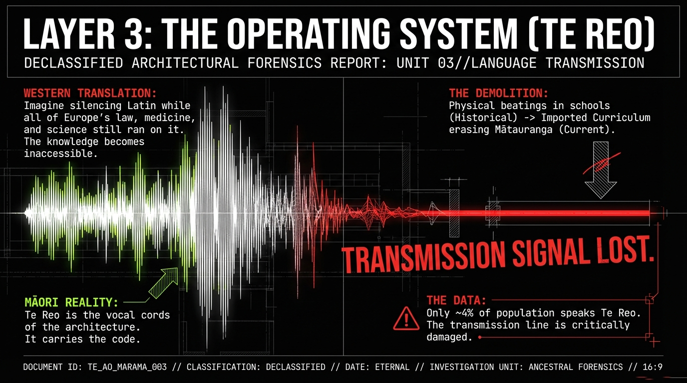 For the Western Mind: Imagine Latin was the only language through which all European law, medicine, theology, philosophy, science, and governance could be accurately transmitted. Now imagine a colonial power made it illegal to speak Latin in schools. Beat children who used it. Spent 150 years insisting that Mandarin was the only "real" language. Within three generations, the entire knowledge architecture built in Latin would collapse. The law codes would become gibberish. The medical texts would be unreadable. The philosophical traditions would dissolve. That is what happened when te reo Māori was suppressed. The whakapapa architecture lost its voice.