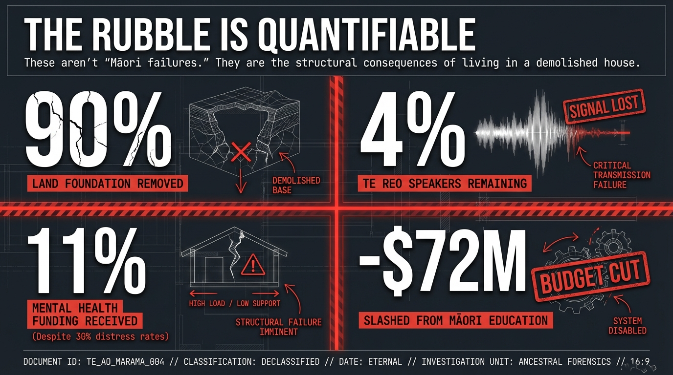 When you demolish the layers of a civilisation's existence framework, the people standing on them fall. Health outcomes collapse. Mental health deteriorates. Incarceration rates soar. Educational outcomes crater. These are not "Māori problems." These are the predictable structural consequences of demolishing a people's foundational architecture and then blaming them for the rubble.
