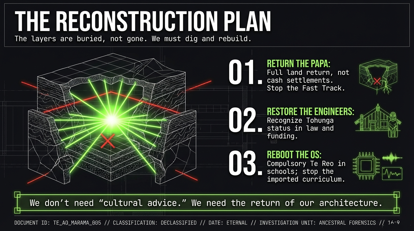 Solution: Full land return mechanisms, not "settlements" worth cents on the dollar. Recognition in law that whenua is a living layer of whakapapa, not a Crown asset to be "settled" with cash. Every Treaty settlement that offers money instead of land is offering wallpaper instead of a wall. Stop the Fast Track. Return the papa.