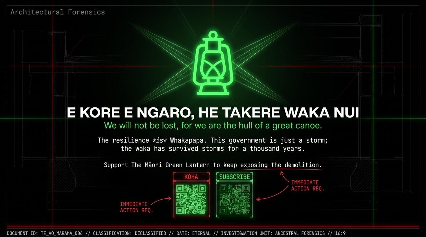 Every layer of whakapapa survives because someone chose to carry it forward—from tohunga to mokopuna, from marae to the digital frontline. This mahi—tracing the whakapapa of colonial demolition, naming the demolishers, exposing the money trails that fund the wrecking ball—continues only because whānau fund it. Every koha rebuilds a layer the Crown tried to bury. It signals that rangatiratanga includes the power to fund our own tohunga of accountability, our own kaitiaki of truth.