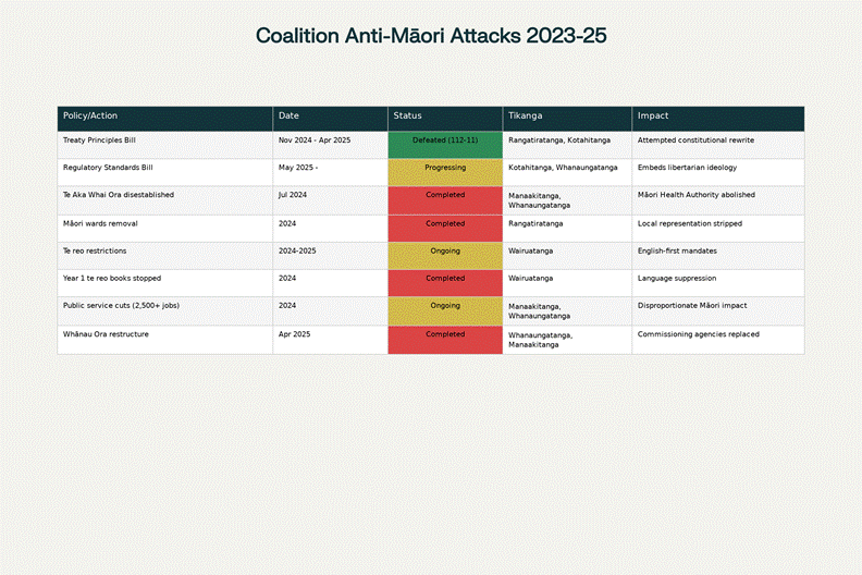 Systematic analysis of eight major coalition government policies targeting Māori rights and services from 2023-2025, showing violations of tikanga and constitutional principles.