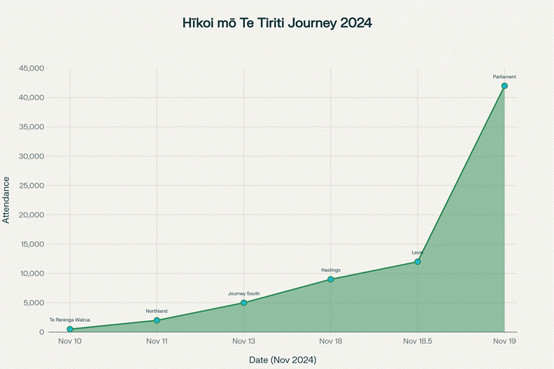 The nine-day journey of Hīkoi mō Te Tiriti from Te Rerenga Wairua to Parliament, growing from hundreds to an estimated 42,000-100,000+ participants by November 19, 2024.