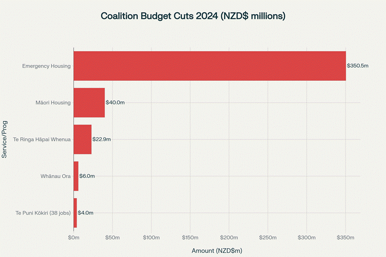 Budget 2024 slashed $40 million from Māori housing, $22.9 million from Te Ringa Hāpai Whenua, $6 million from Whānau Ora2,500+ public service jobs cut, disproportionately impacting Māori workers and Māori-focused teamsTe Puni Kōkiri (Māori Development Ministry) cut 38 positionsTe Aka Whai Ora (Māori Health Authority) disestablished entirely under urgency, removing Waitangi Tribunal jurisdiction